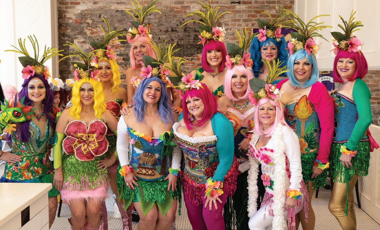 on preparations for next year. Together, we brainstorm themes, discuss ideas on how to improve and continue to build our organization, and begin planning. The royals’ duties also include communication through email, sourcing accessories, illustration design boards of bustiers, designing t-shirts and specialty throws and providing guidance to their groups. The captains also help the ladies in their group with bead parties, advice, and are in charge of our annual masquerade ball, which is always fabulous. From there, it is a very busy year! My daughter Claire and I work to reserve the venues for our events for the year—the Hat Party, Masquerade Ball and Grand Luncheon, as well as hotel accommodations and balcony space. Additionally, we get insurance for the group, hire photographers, security and a jazz band, secure all permits and ensure we have a police escort. There are a lot of moving parts. And once our theme is decided, I start designing the headpieces.”