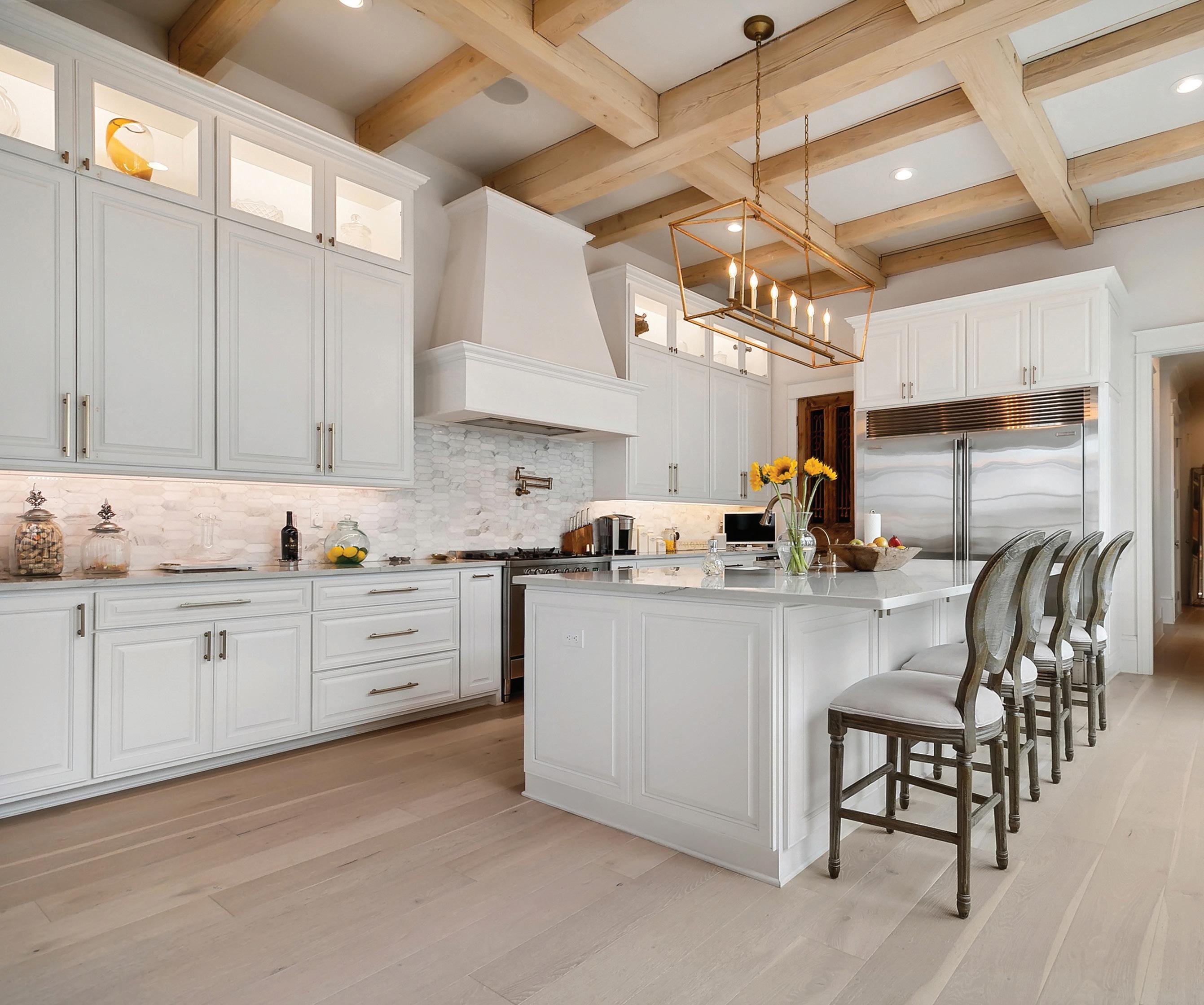 AAt 2,445 square feet, the Truitt home is hardly small, comprising three bedrooms and two and a half baths, along with the kitchen, dining room, laundry room, and living room in its two levels. Outside, the living space is maximized with a full outdoor kitchen, sparkling pool and hot tub, and outdoor sitting area. But inside is where white proves its strength in standing on its own. Walls, ceilings, molding, trim, even window treatments and cabinetry and counters…all perfect in their stark whiteness, yet somehow managing to avoid the cold sterility one would expect of such an expanse of white. The trick? Mixing in elements of wood and gold, and introducing different textures as well as muted colors through the use of various pieces of artwork, including custom works from Maddie Goff and Elizabeth Impastato. In doing so, designer Lesle Veca of V Interiors created a tranquil look that also humanizes the space and gives it a welcoming, liveable feel.