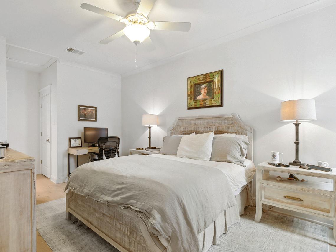 In the master suite, the use of white lends itself to creating a spa-like space perfect for escaping after a long day at work. The spacious master bath features a freestanding clawfoot tub and separate walk-in double shower, with a dual-sink vanity that runs the length of one wall.