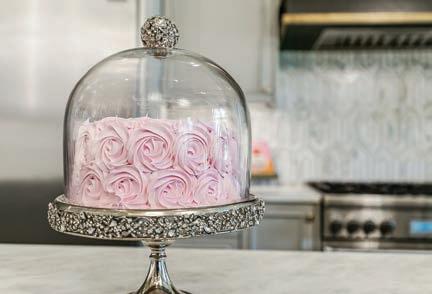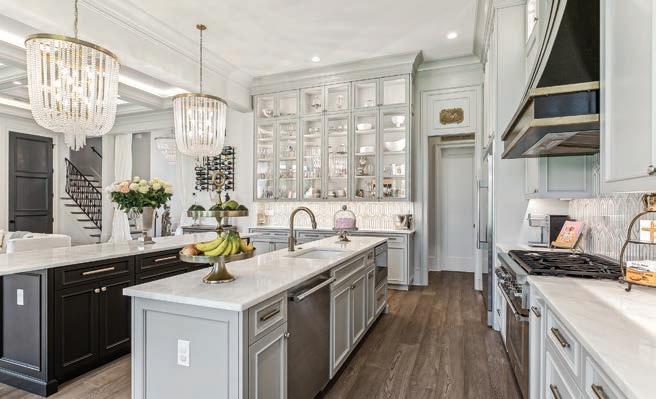 That love of beautiful things is evident throughout the home in its décor, luxurious finishes and styling. The kitchen, one of the most used spaces for the large Buie family, is particularly note worthy for its white custom cabinetry along the perimeter of its L-shaped space, with backlighting in the glass-fronted side cabinetry and a striking tiled backsplash. Dual islands offer contrast, with a dove grey center island and a far island in black cabinetry—all crowned with Calcutta marble. Thermador appliances add a sleek touch, with stunning twin beaded chandeliers hanging overhead.