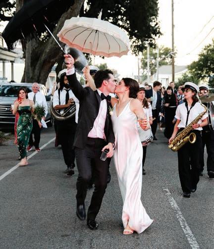 Sweetening up the night, the couple offered their guests three cakes from Bywater Bakery—one dragonfly, one chocolate, and one Chantilly crème. After the evening came to a close, the festivities continued in true New Orleans form with an after-party, which featured a very special guest. “Our good friend ran to our house and brought our dog, Willa, over to the after-party, which was very much a highlight,” Hogan says.