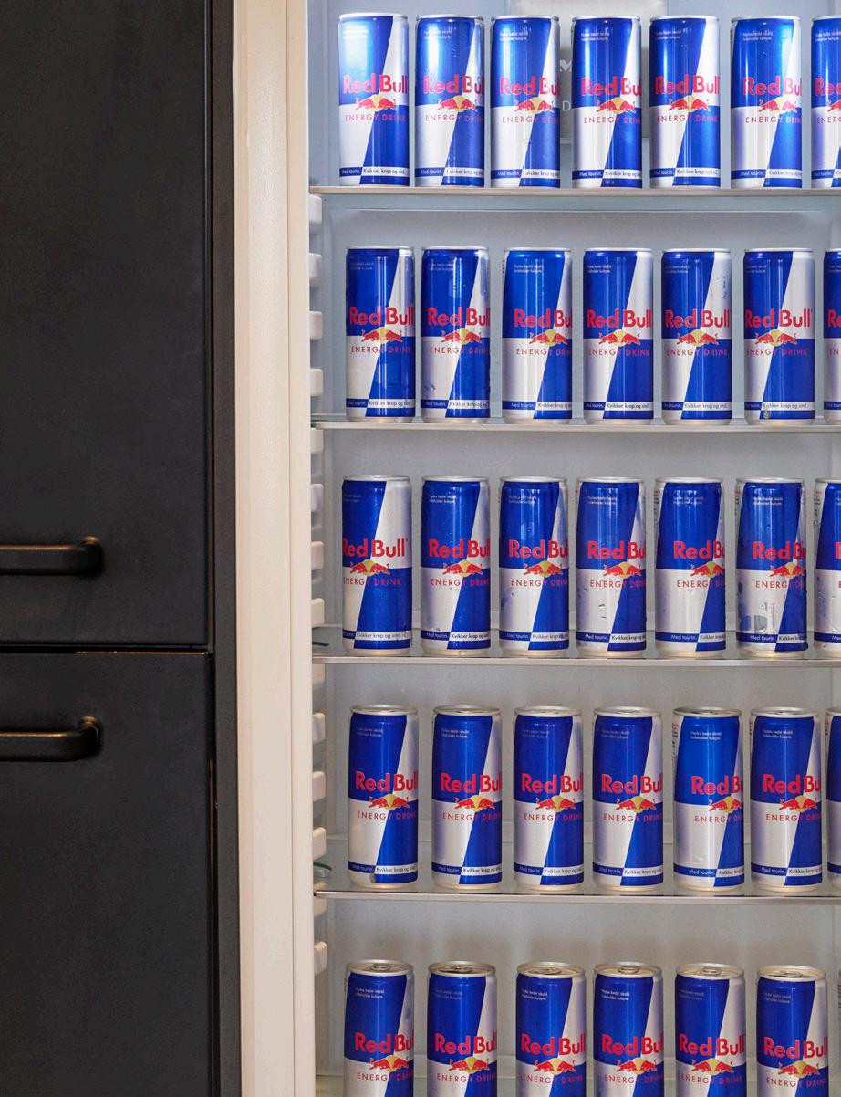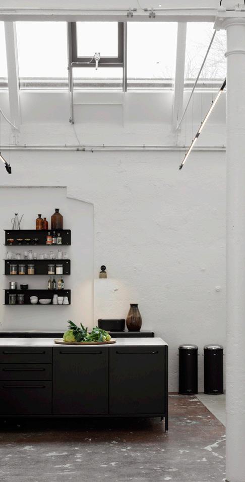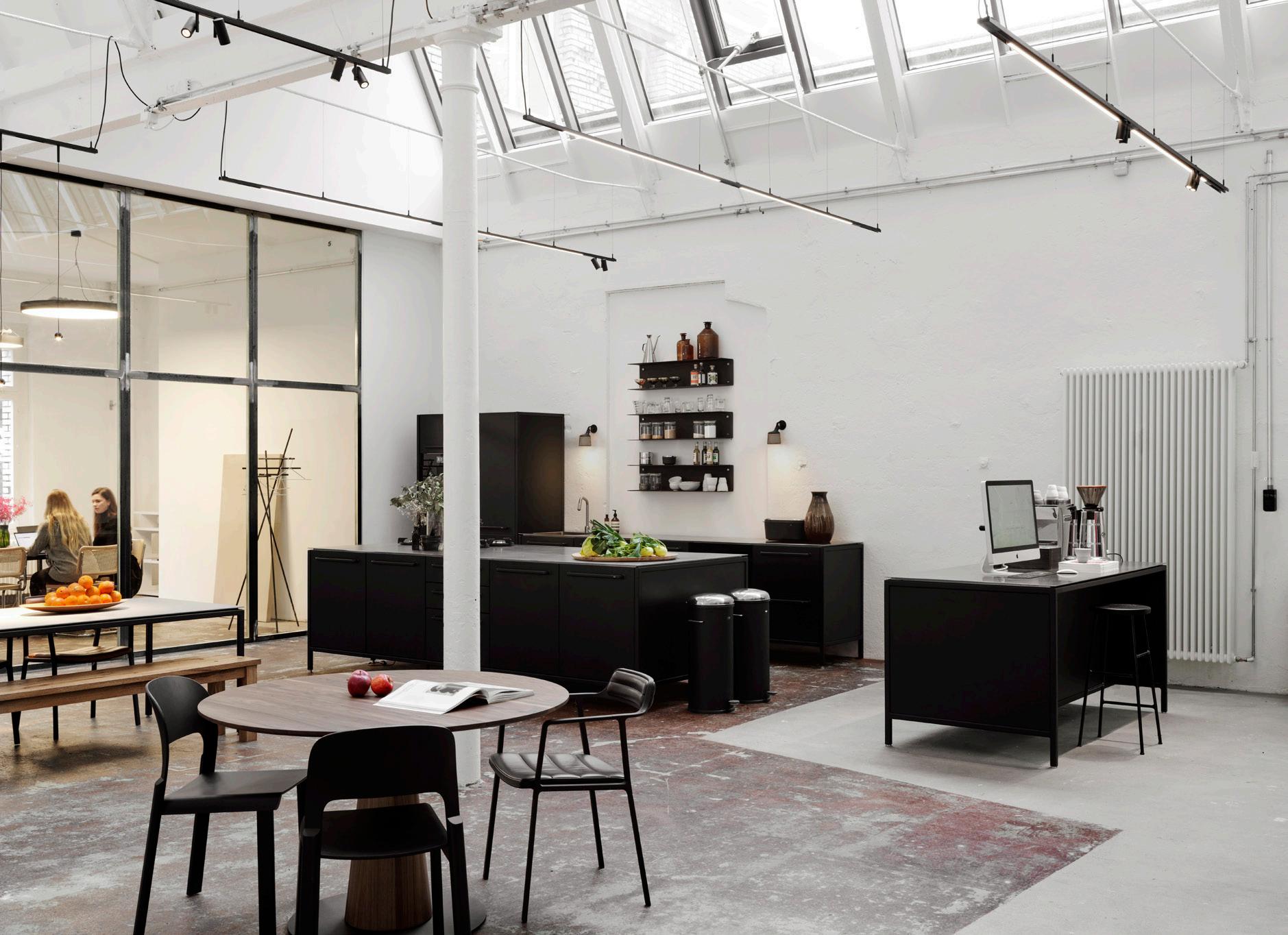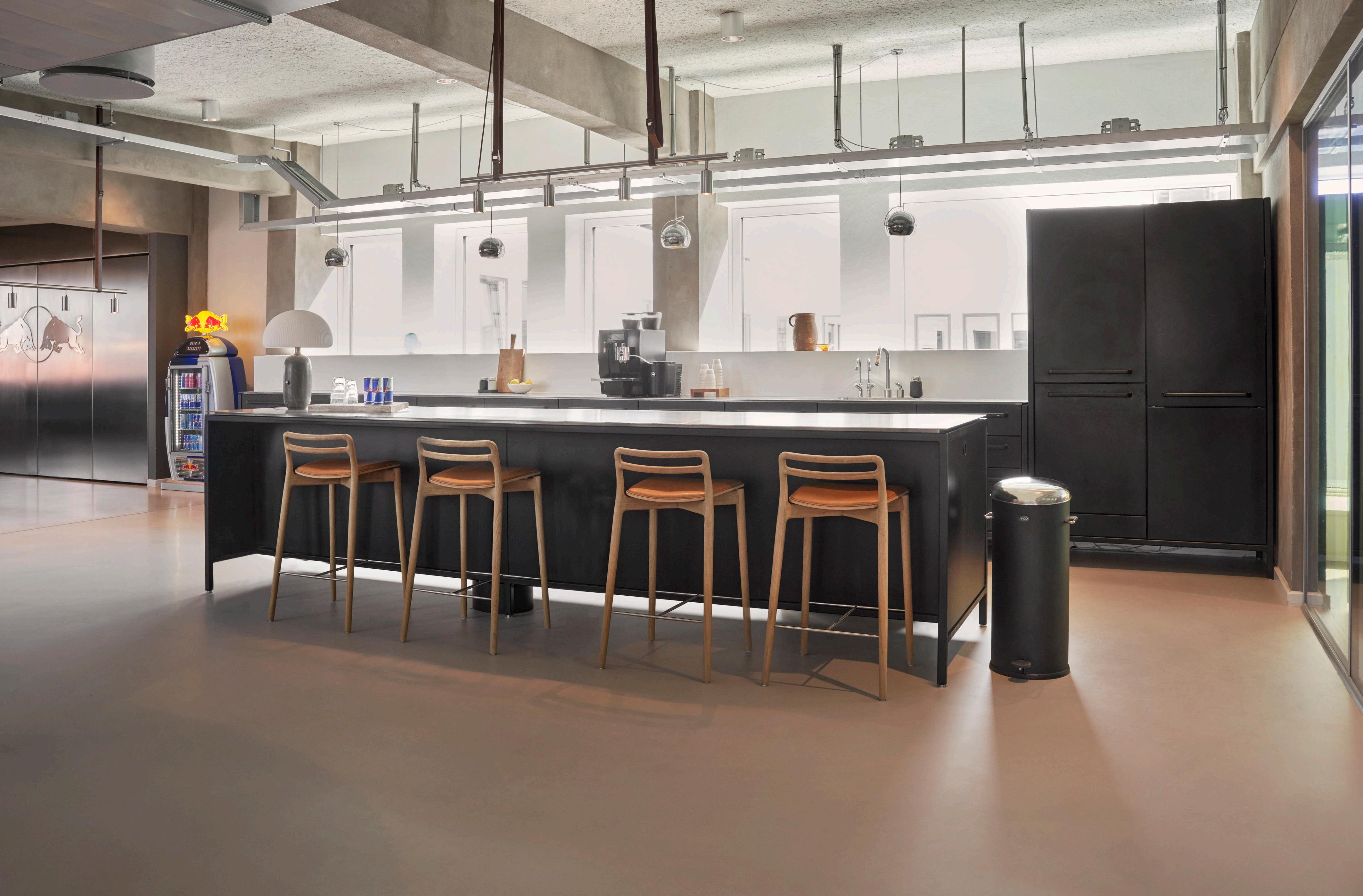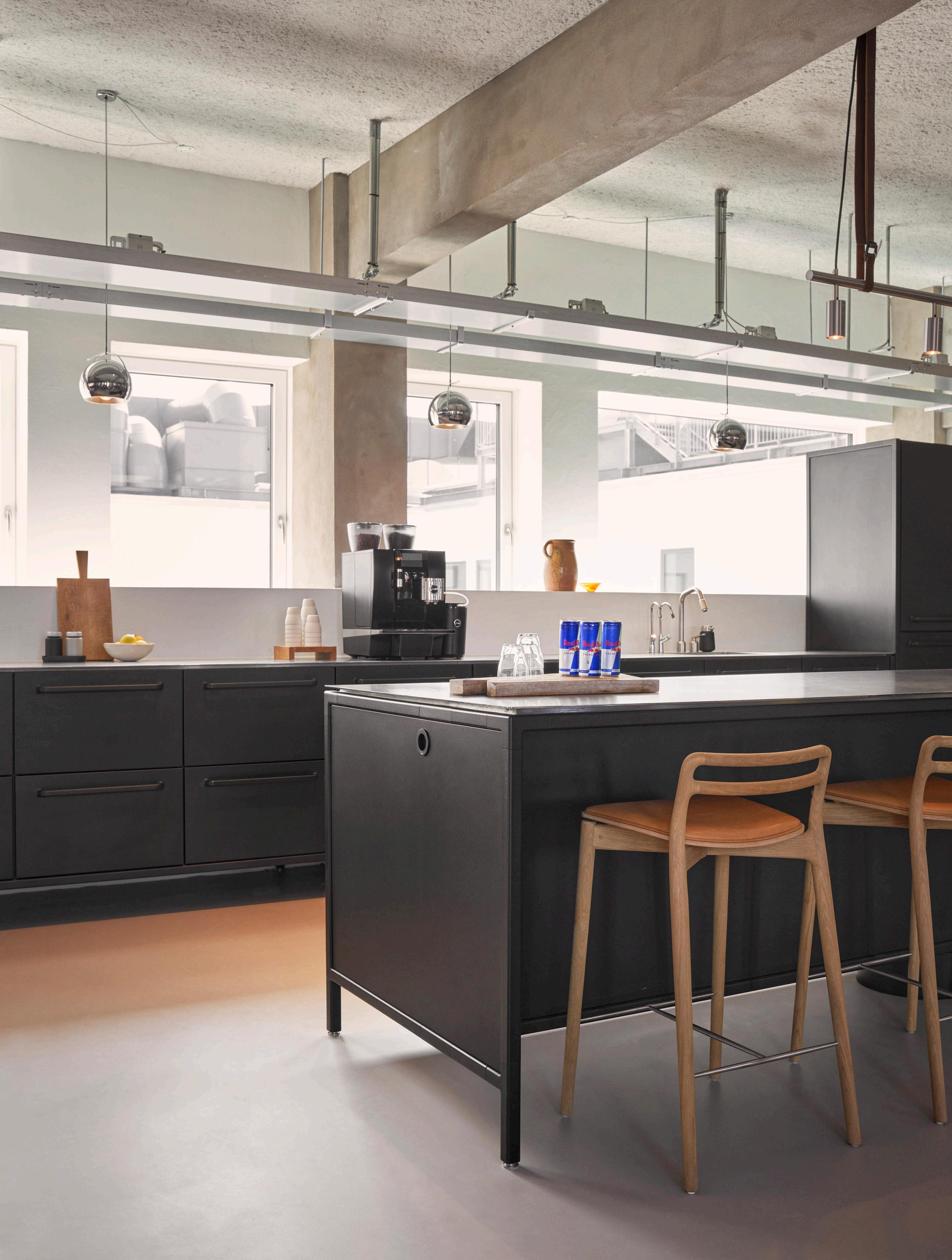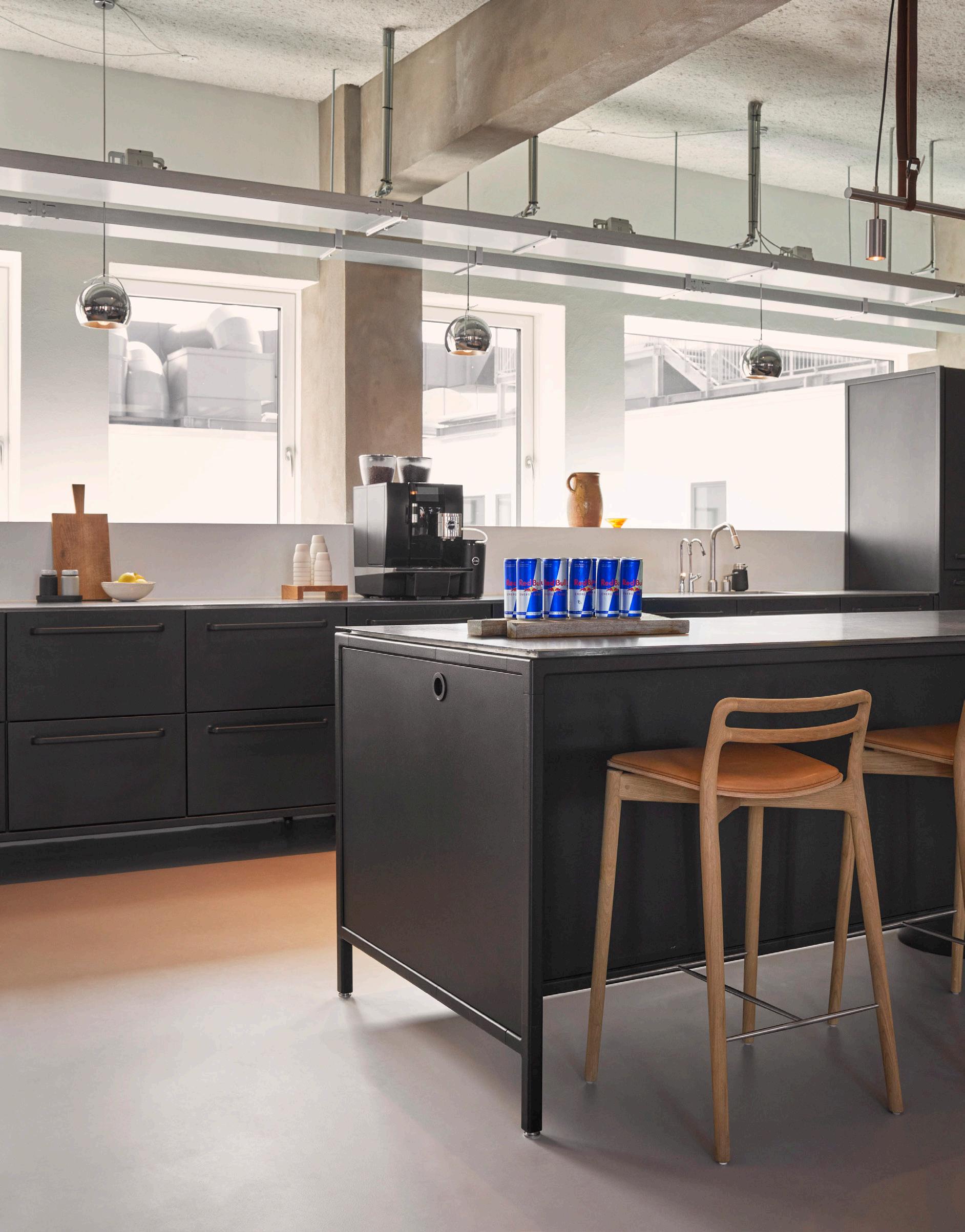 Perched on the top floor of a charming historic building, RedBull Denmark’s headquarters offers sweeping views over Copenhagen’s inner city. Inside, the space is home to Vipp’s V1 kitchen, a striking setup featuring no less than 10 wall modules, 2 tall modules, and a long island with seating.