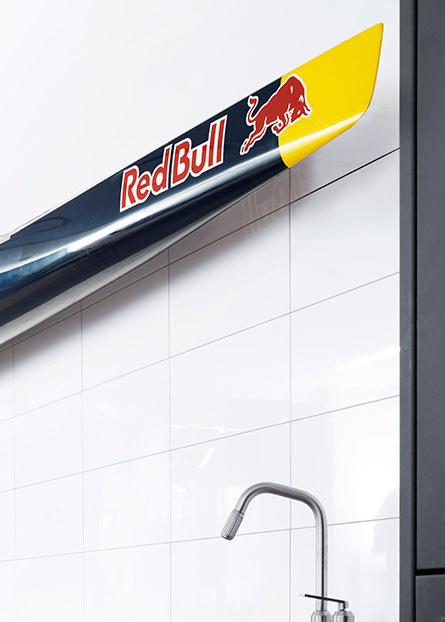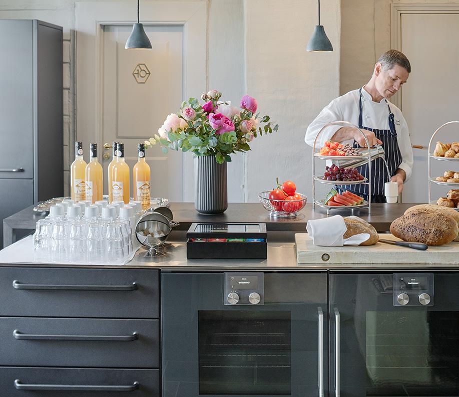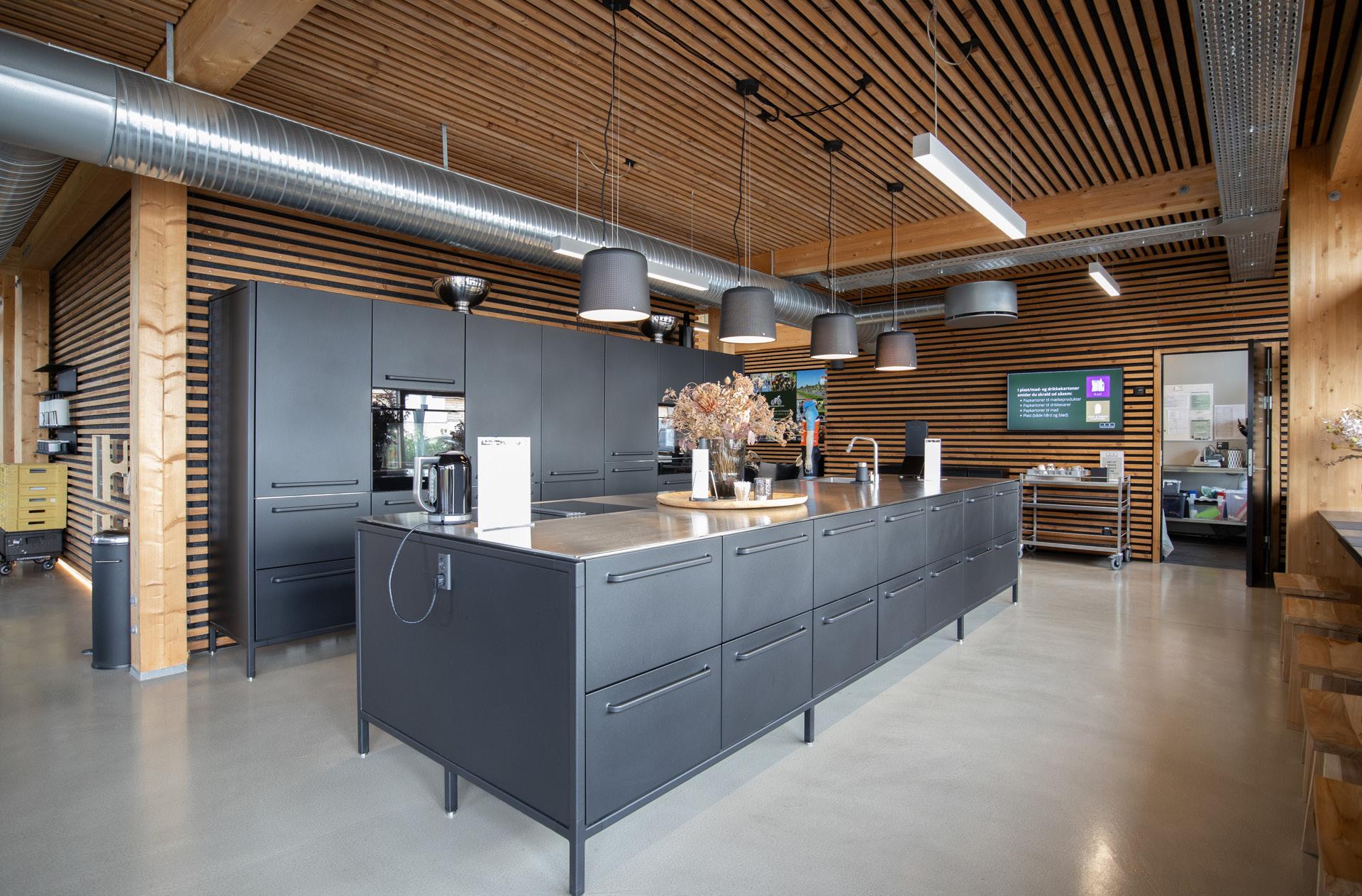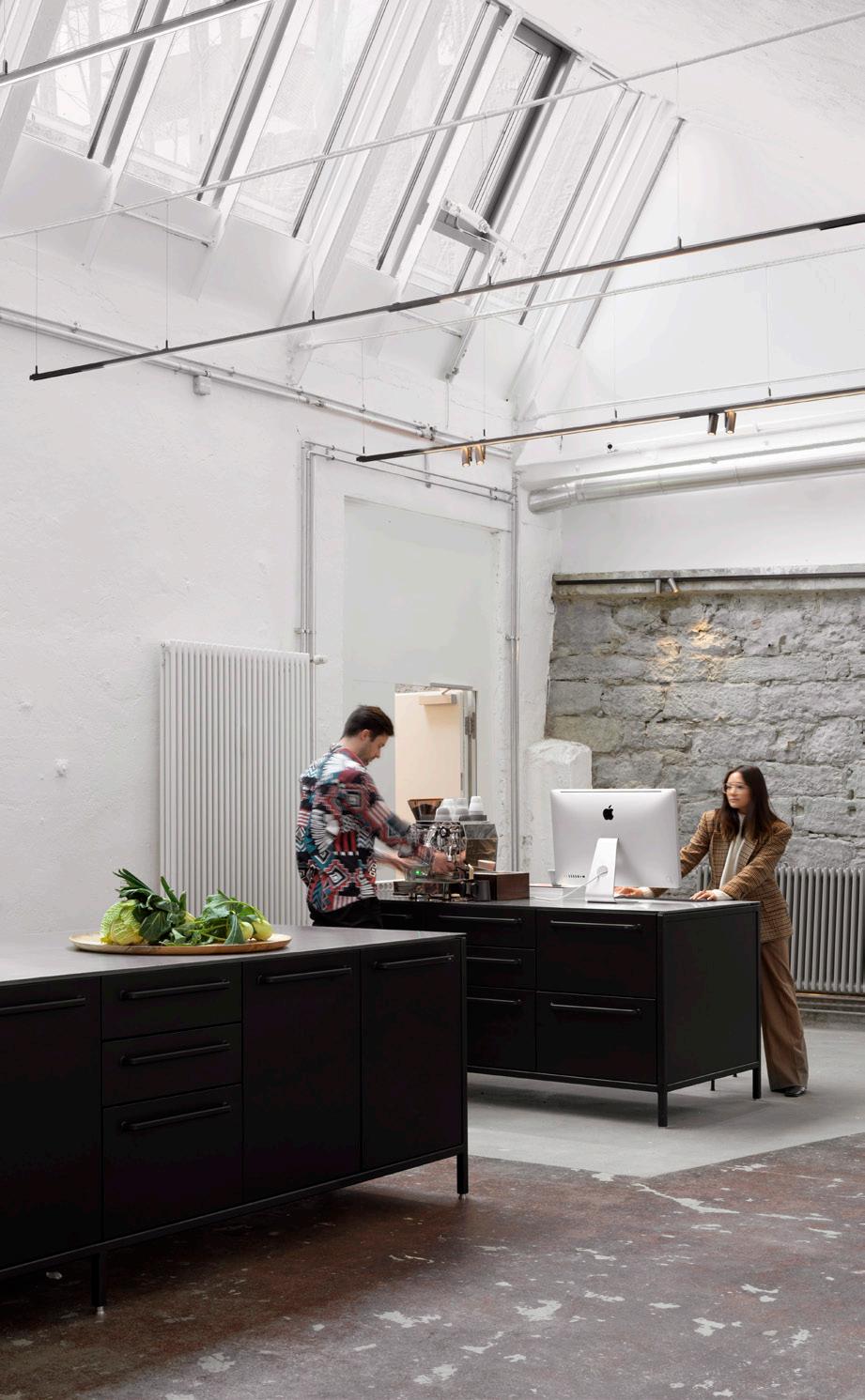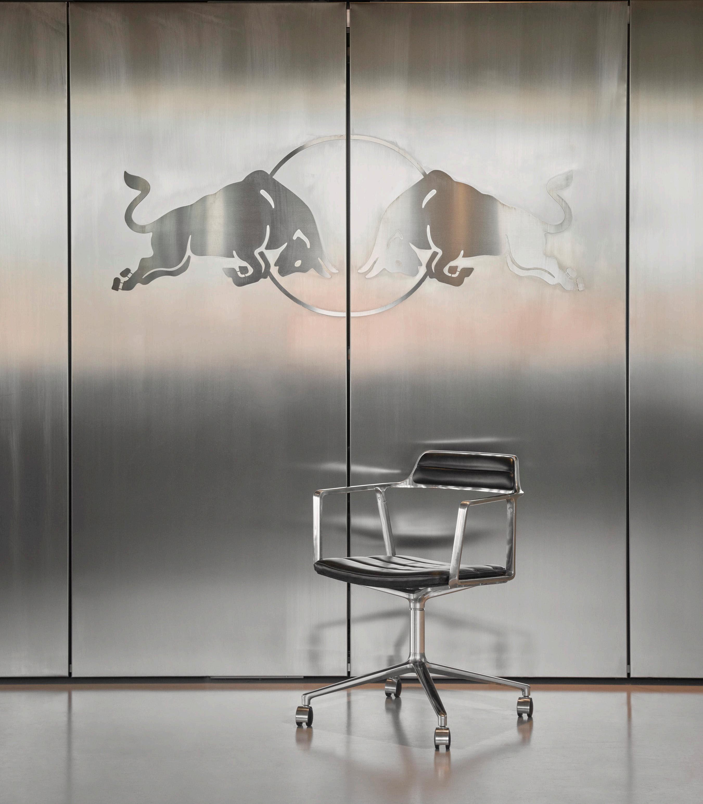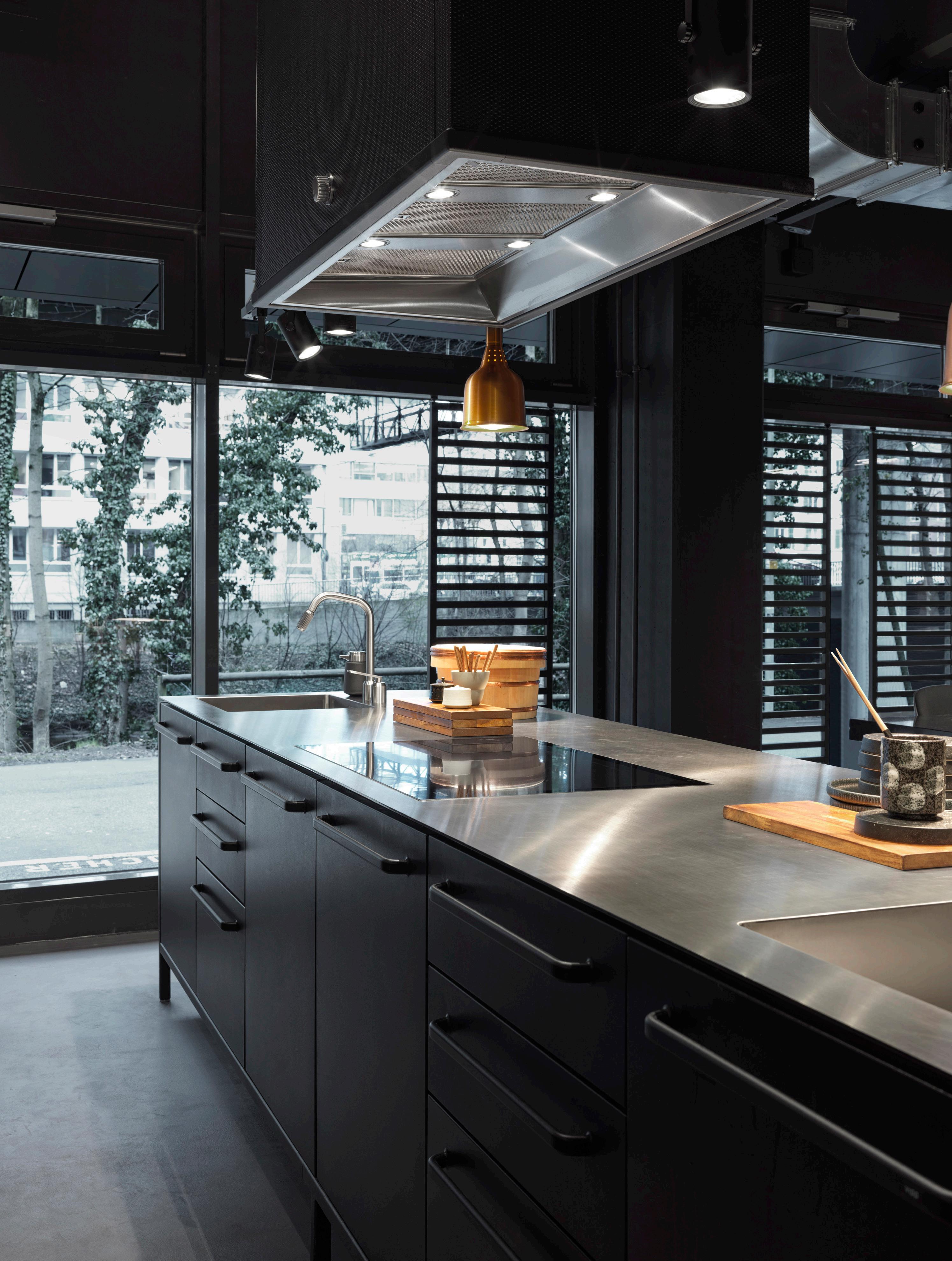 Perched on the top floor of a charming historic building, RedBull Denmark’s headquarters offers sweeping views over Copenhagen’s inner city. Inside, the space is home to Vipp’s V1 kitchen, a striking setup featuring no less than 10 wall modules, 2 tall modules, and a long island with seating.