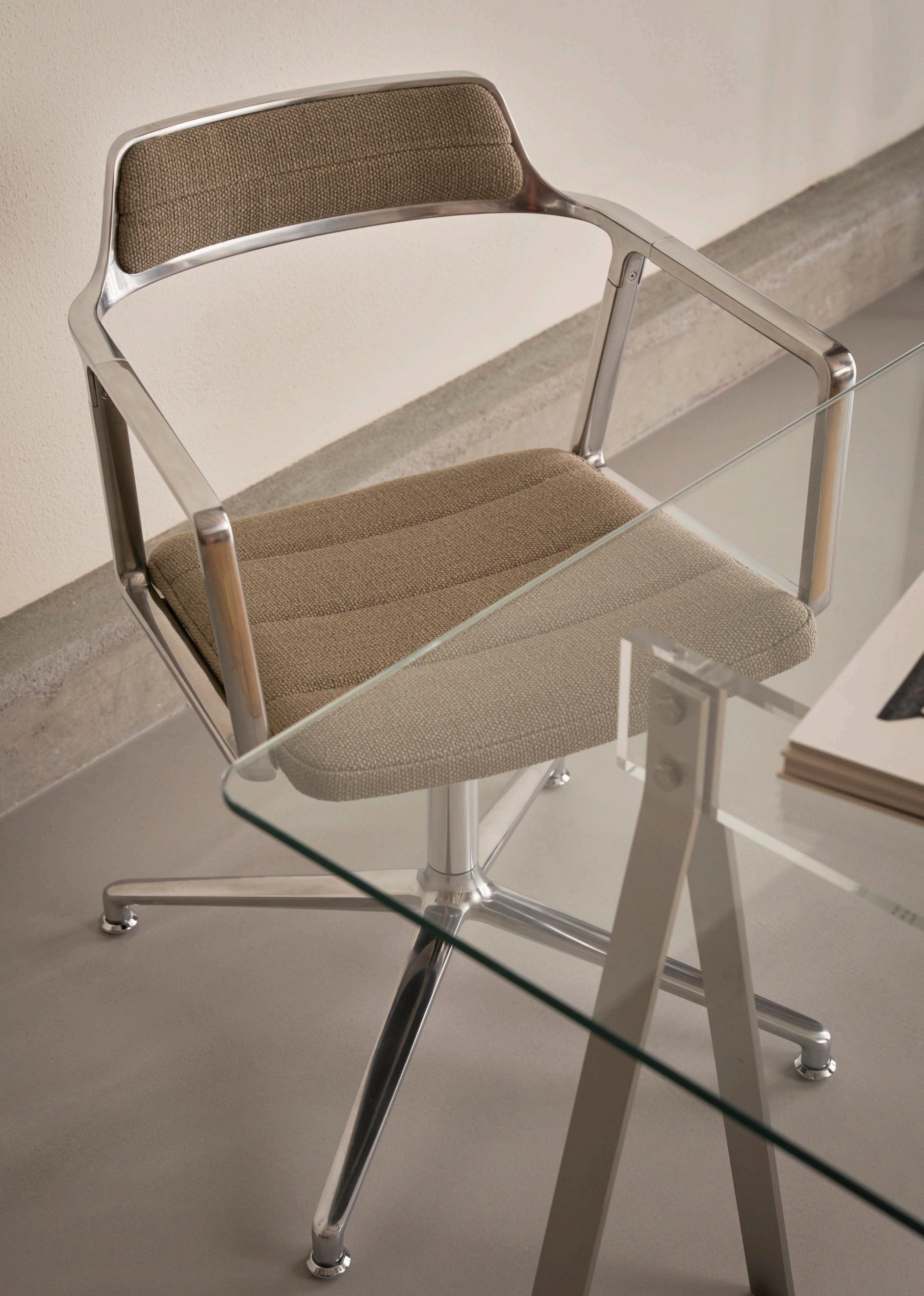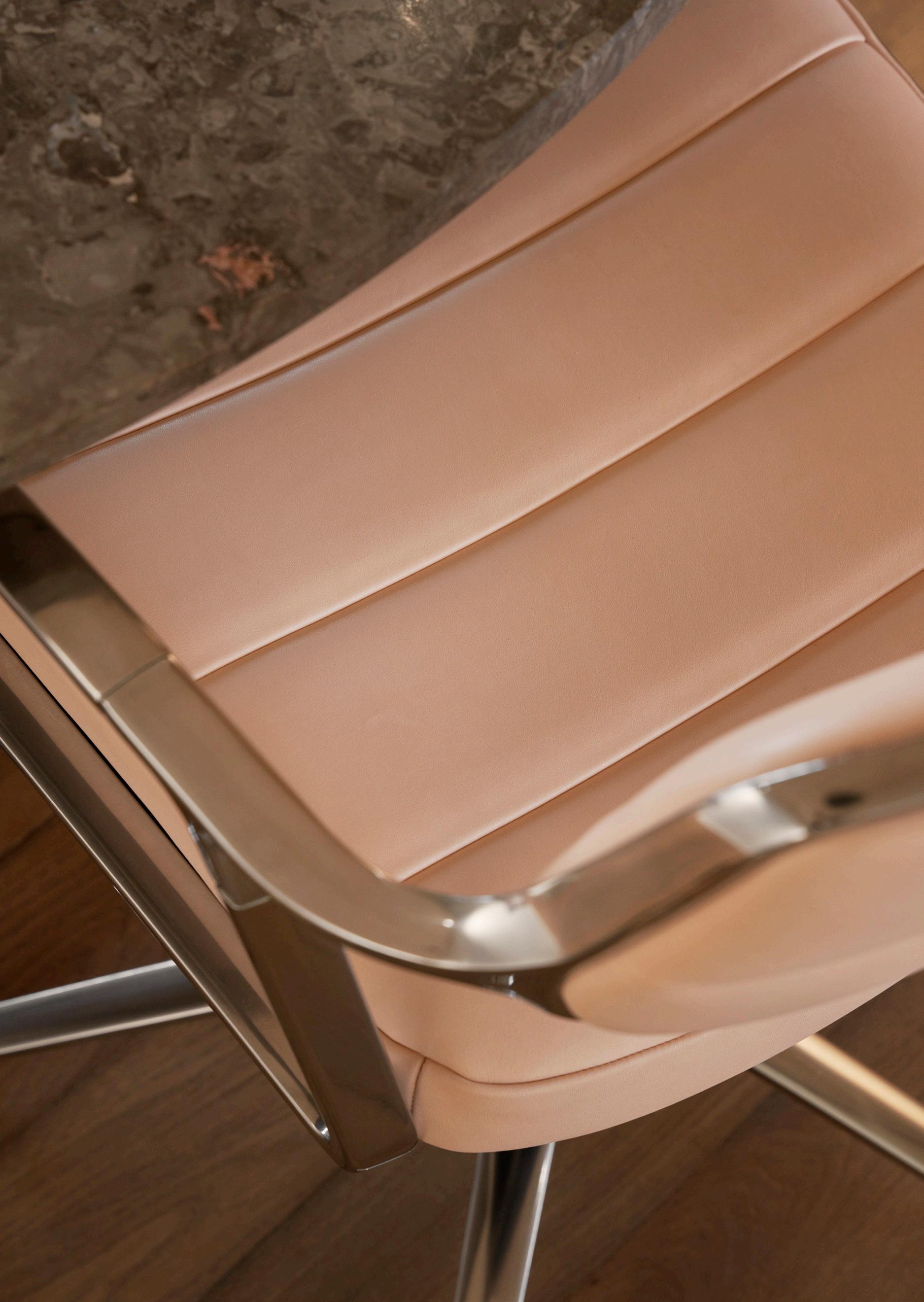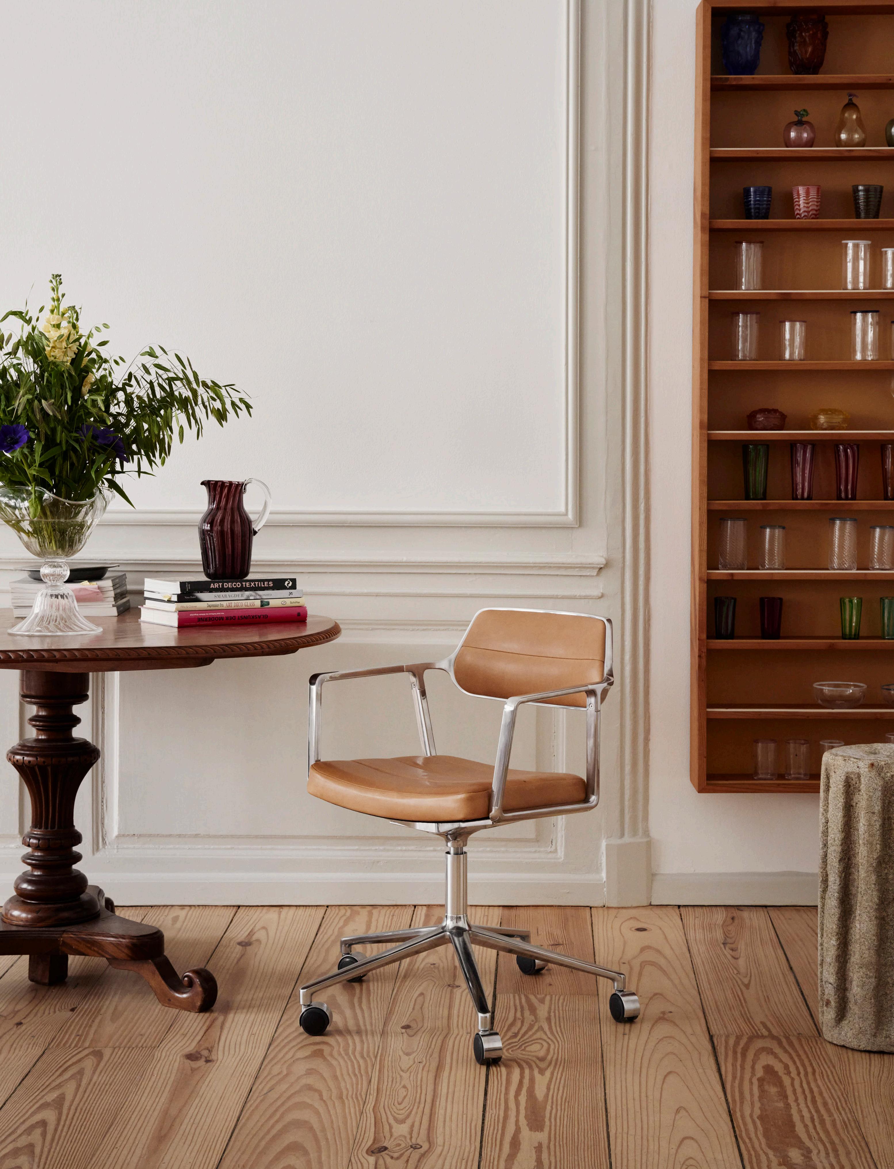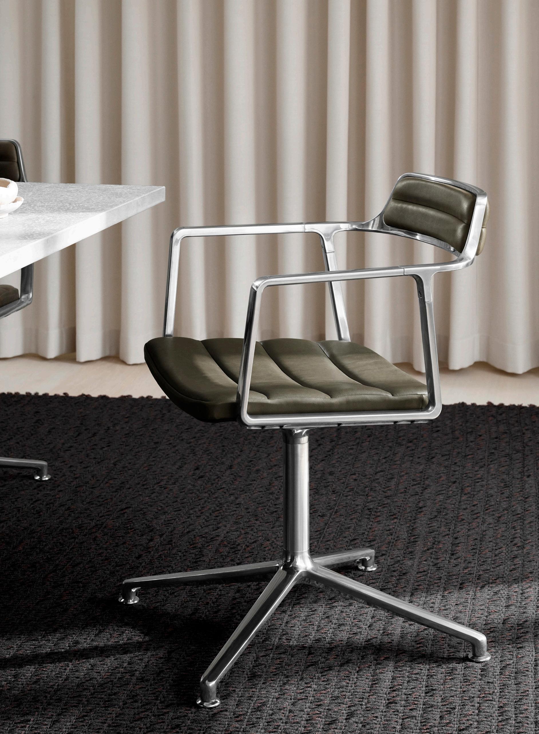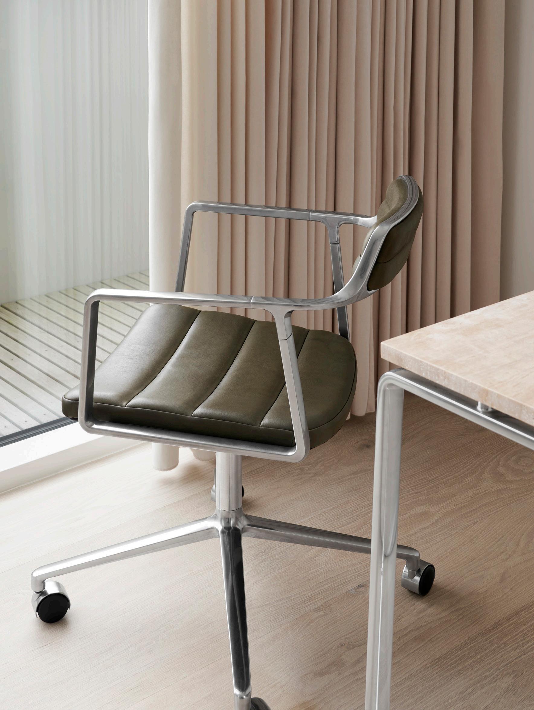 Vipp Swivel chair is suitable for the home office or meeting room. The chair features a polished or powder-coated aluminium frame with an upholstered leather seat and backrest.