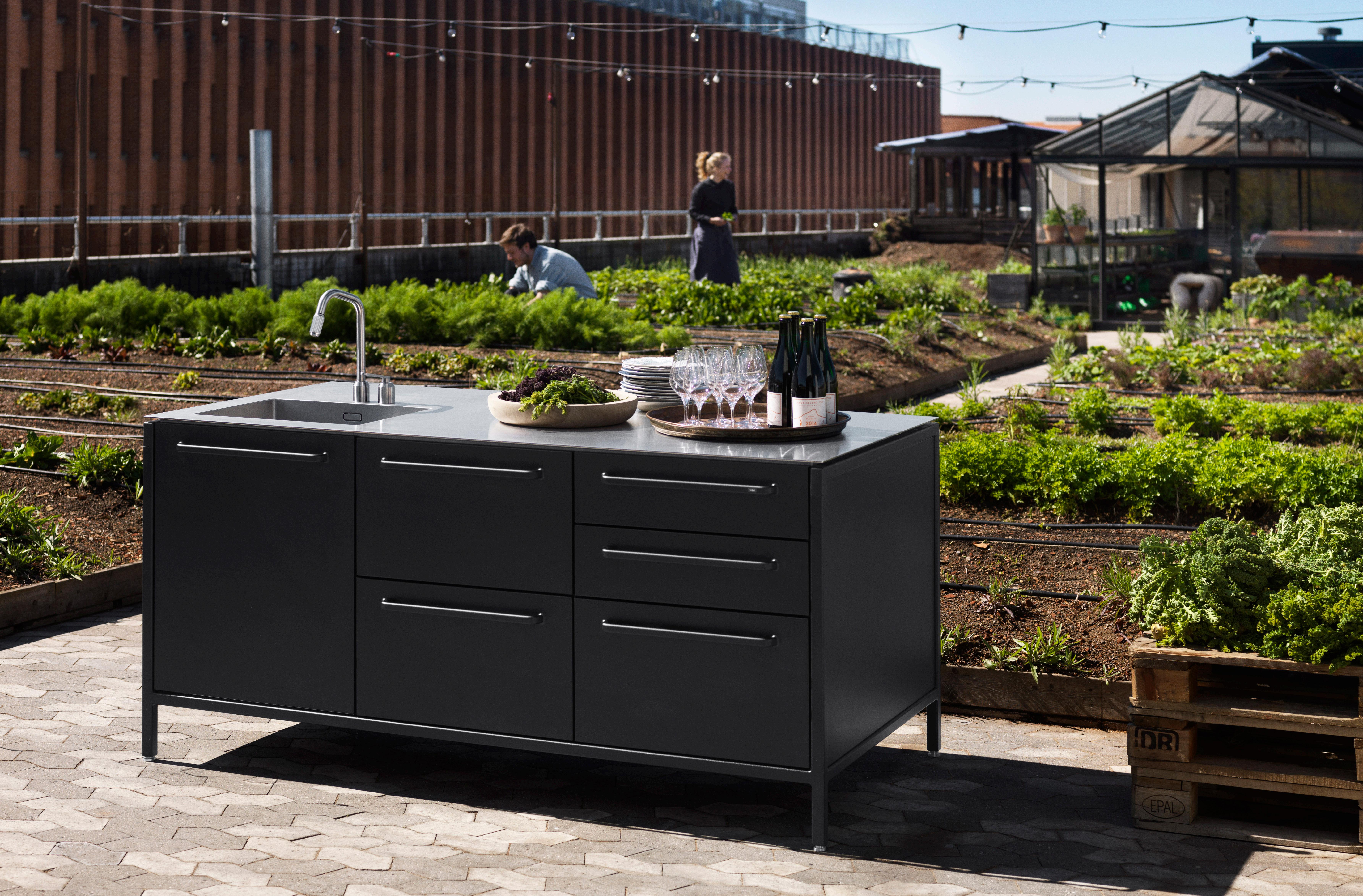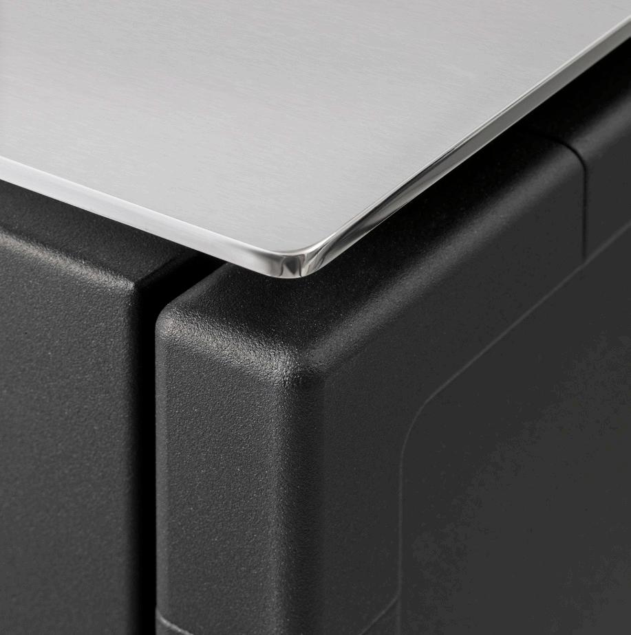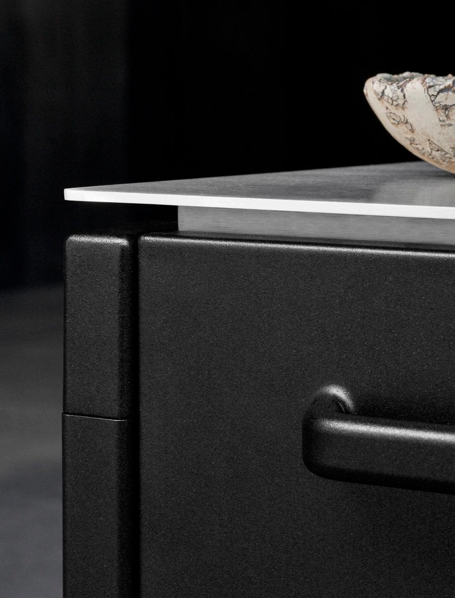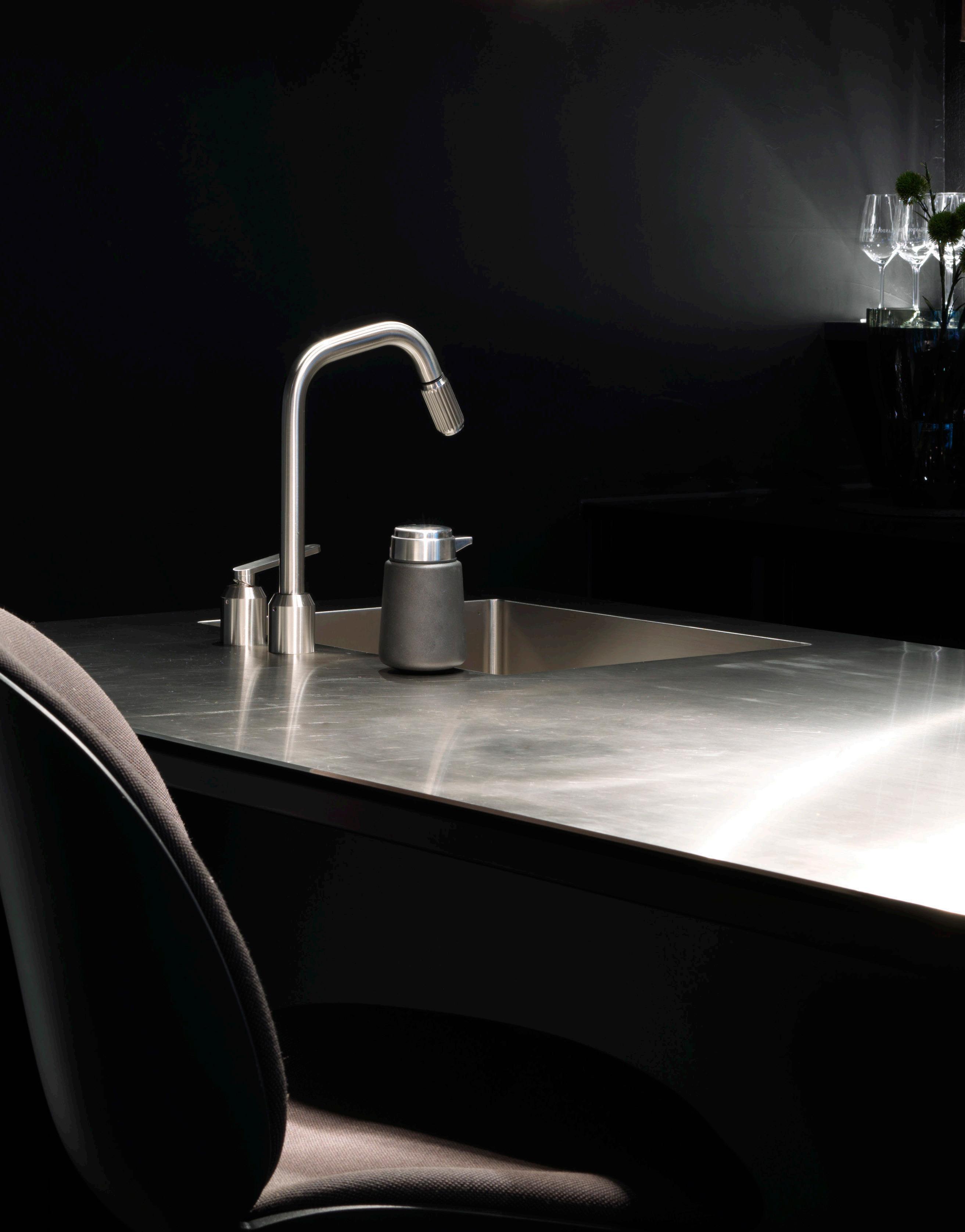 The corners of the stainless steel work-top and powder-coated aluminium frame are rounded for a soft take on industrial materials.