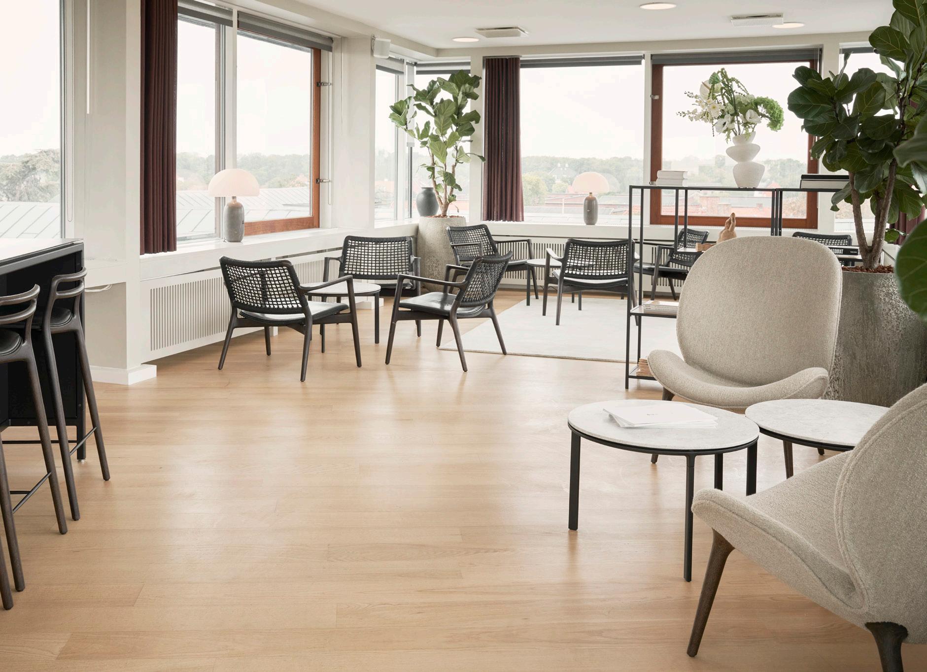 On the fourth floor of the co-working space located at Strandvejen, Hellerup, you will find a lounge area offering a breathtaking view of Øresund.