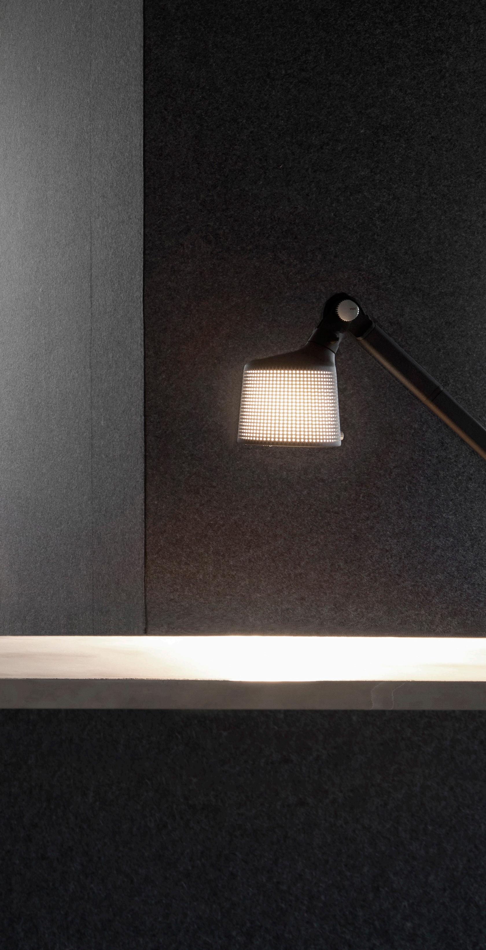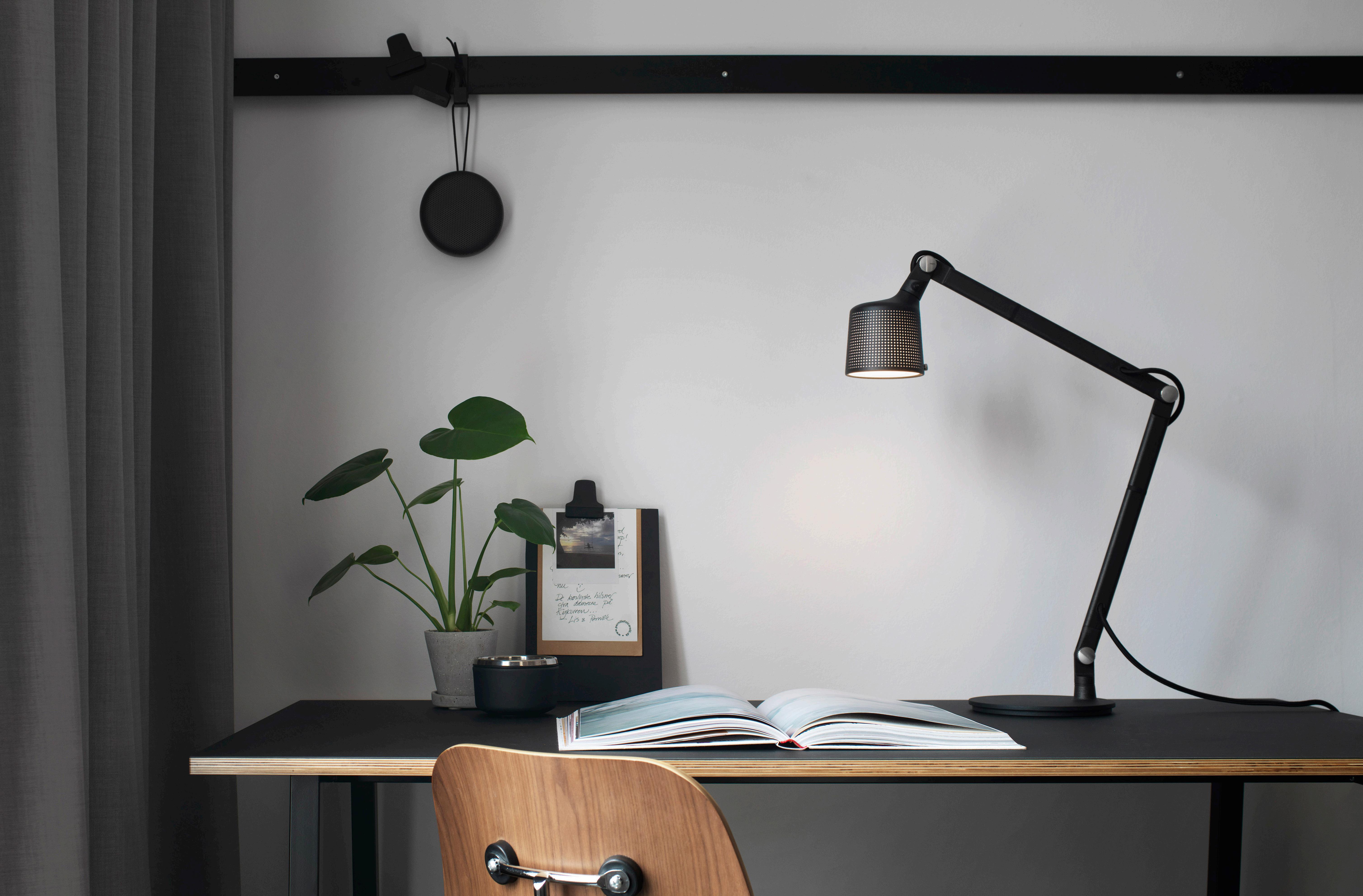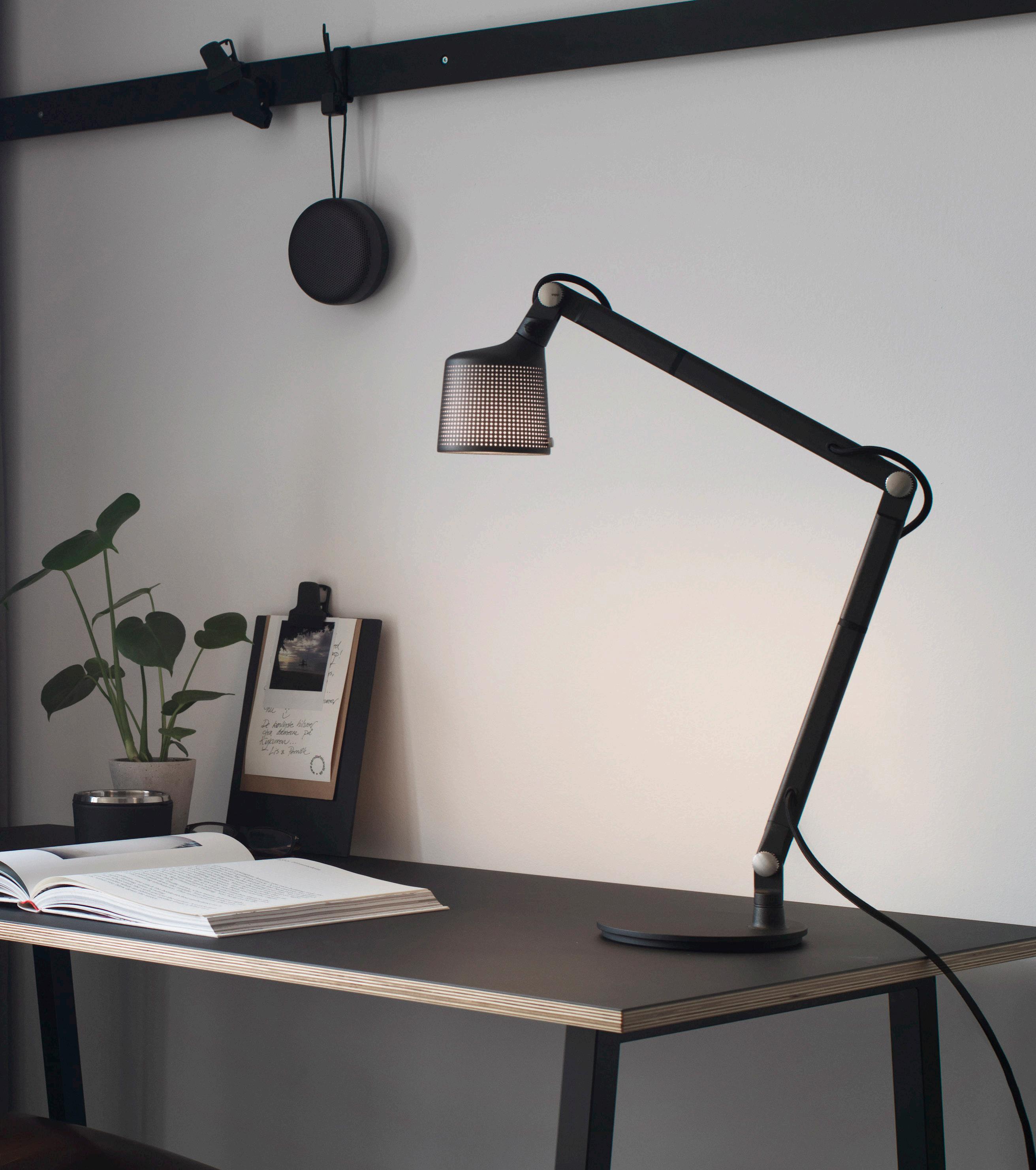 The desk lamp is suitable as a work lamp for the office or the home. Equipped with an adjustable arm, finger screws, and a solid base for stability, the steel lamp shade is designed with 1539 perforations, allowing for soft light to be let out through the solid surface.