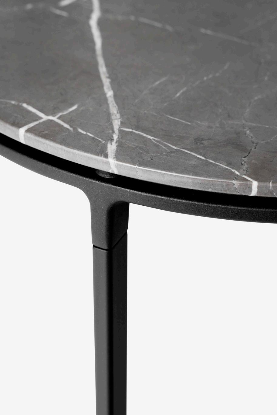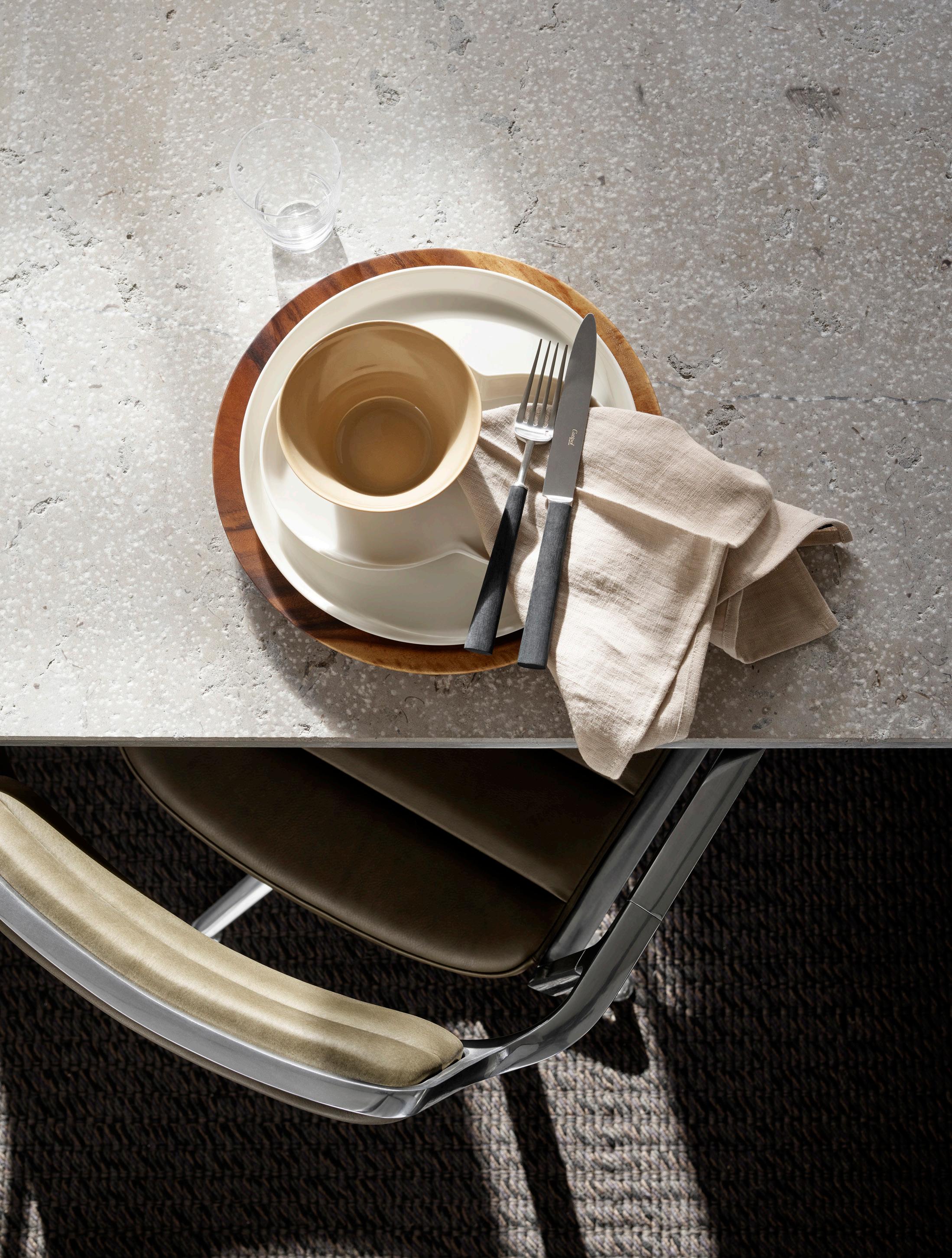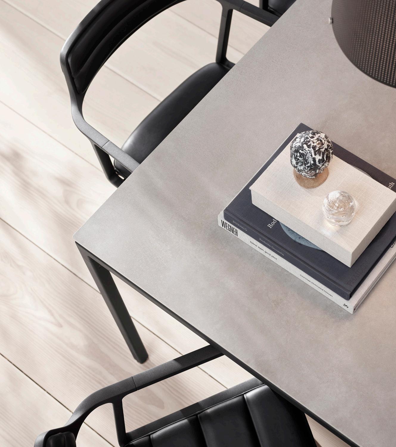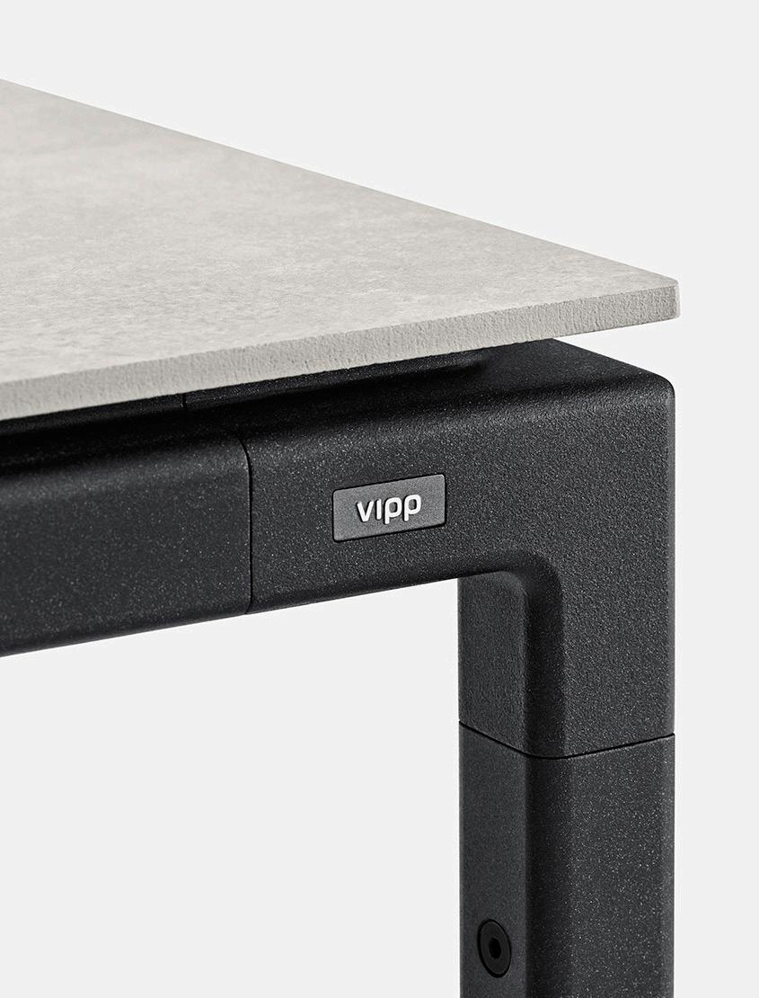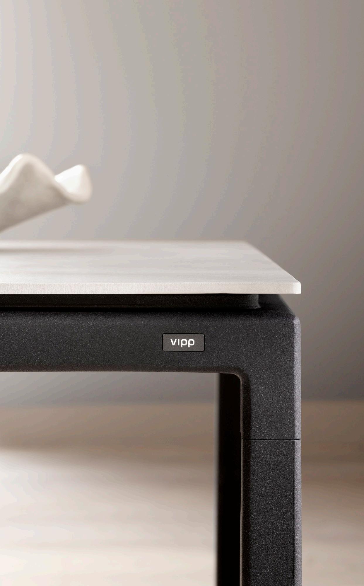 The Vipp table is available in a medium and large version, featuring a steel frame and a highly durable tabletop of ceramic.