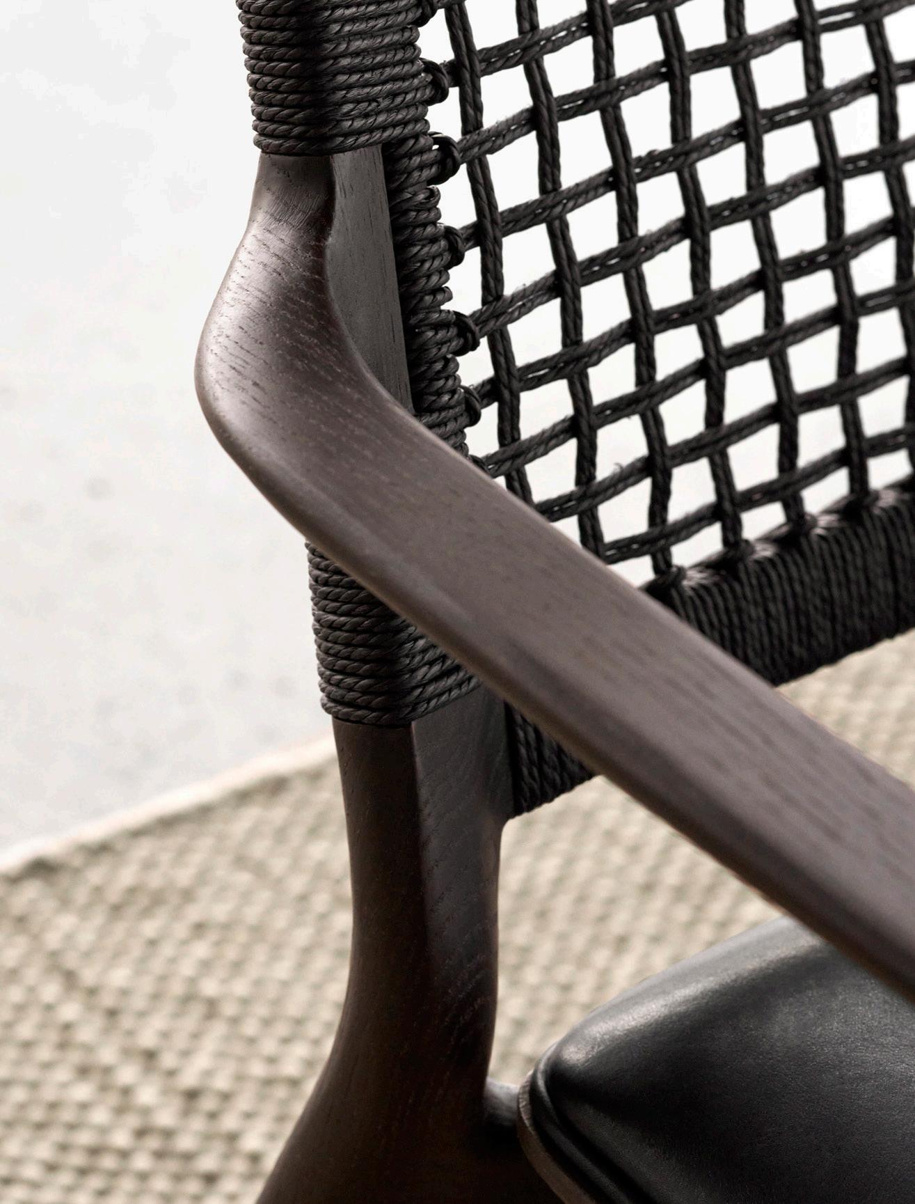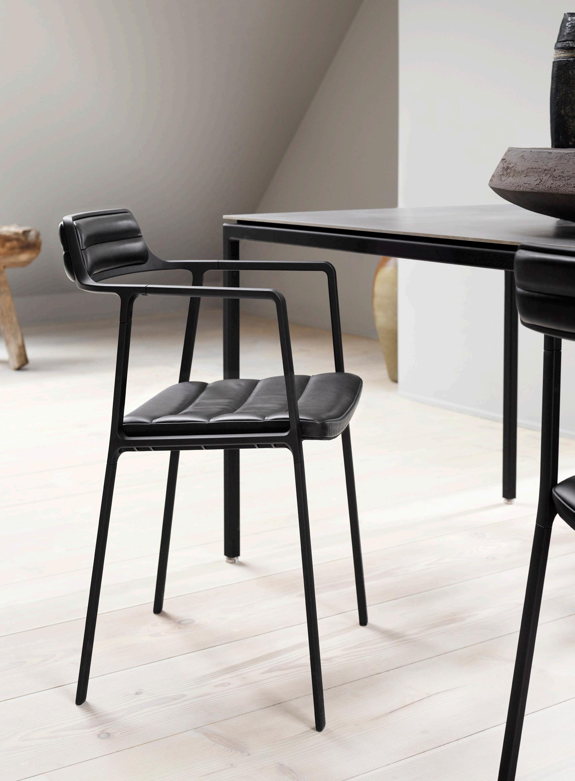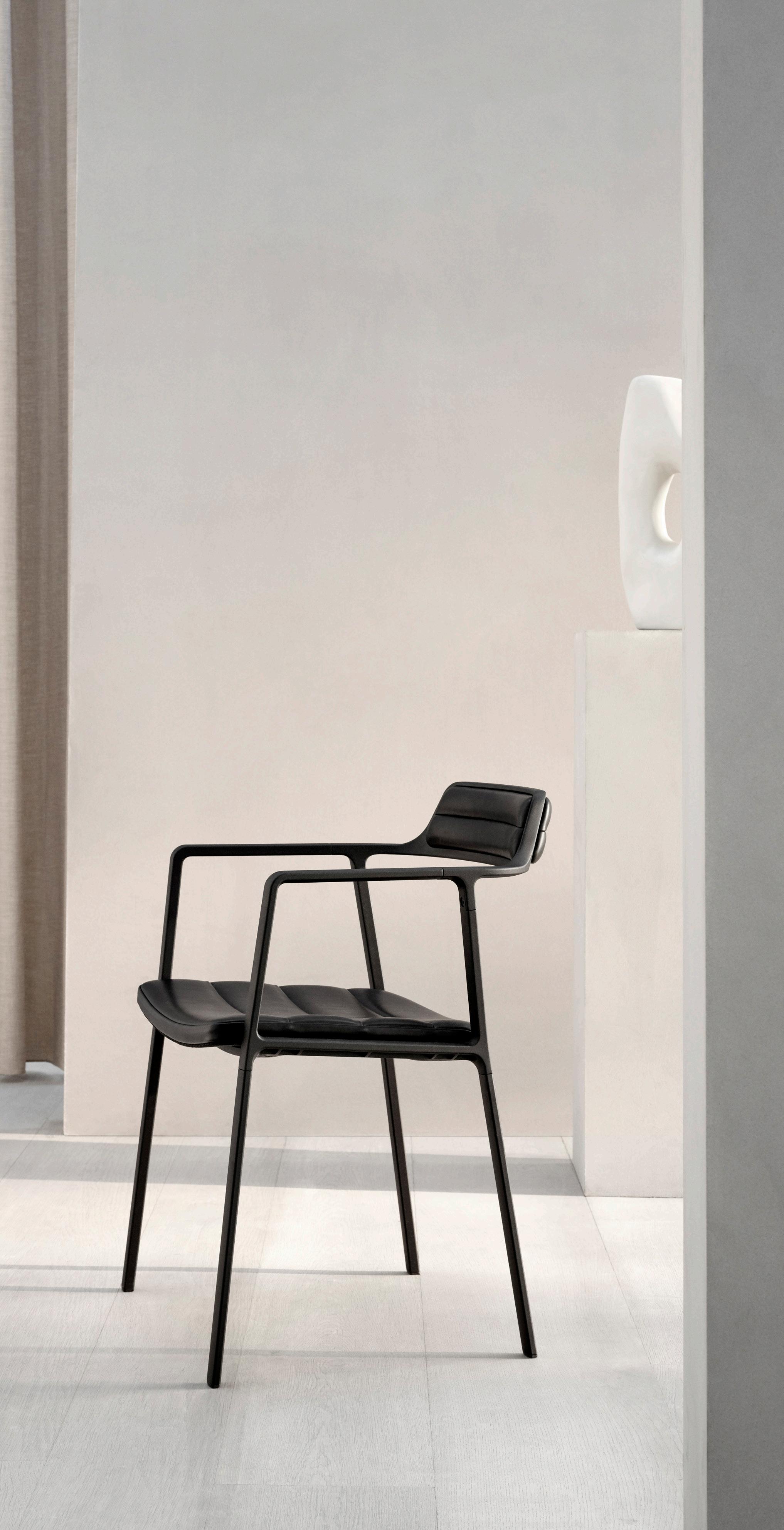 The slender armrests continue straight into the discreet, padded backrest, giving the armchair an