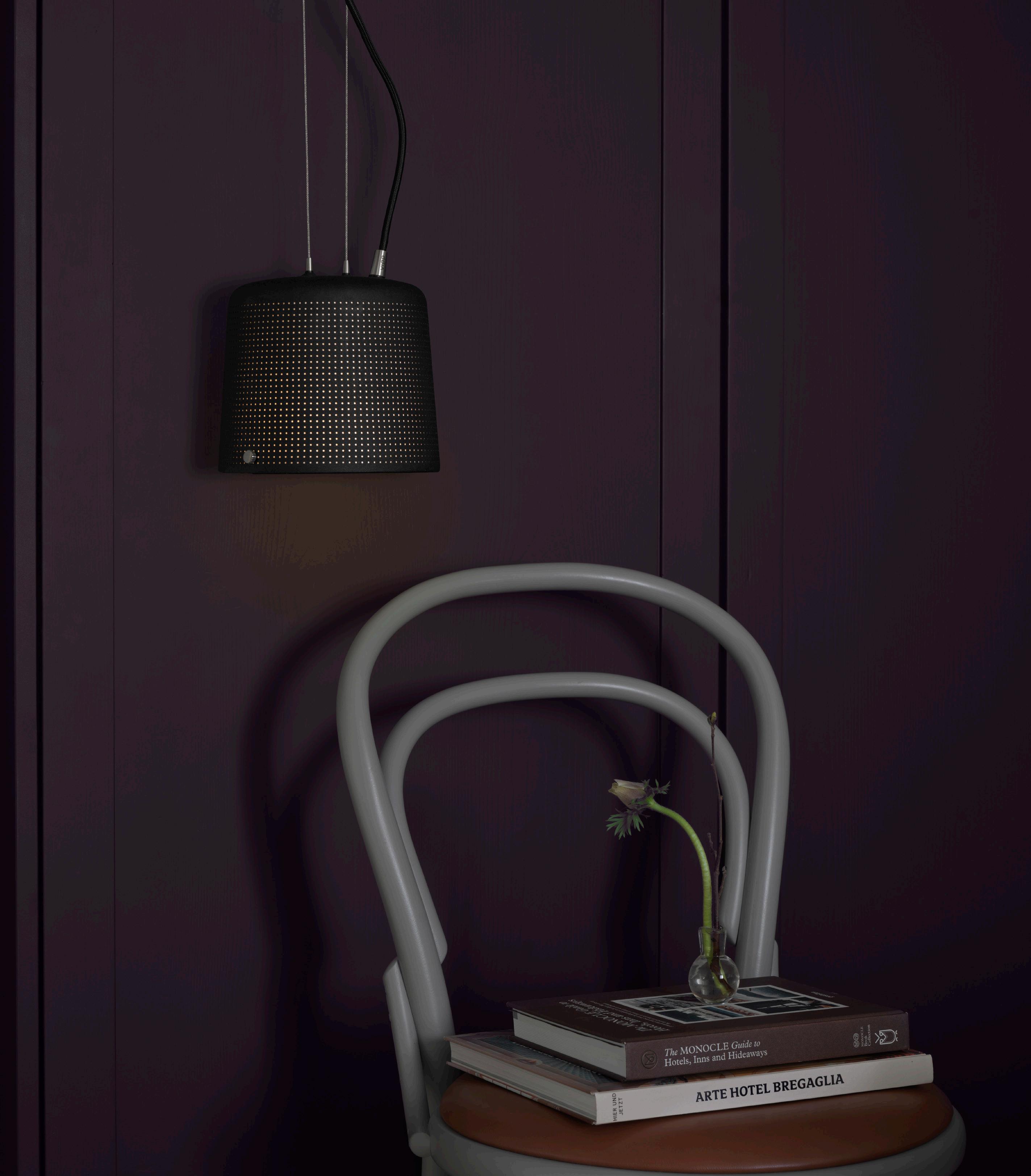 The desk lamp has a perforated shade and matte glass for a pleasant diffusion of light.