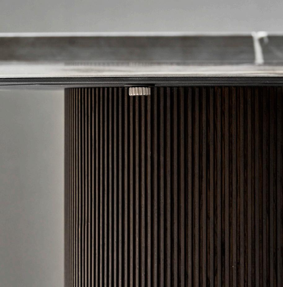The Vipp table is a large table for the dining room or kitchen. Also available in a medium-sized version, the table features a steel frame with soft rounded corners and carries a highly durable tabletop of either heat-pressed ceramics or chevron-patterned, dark oak.