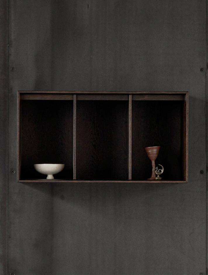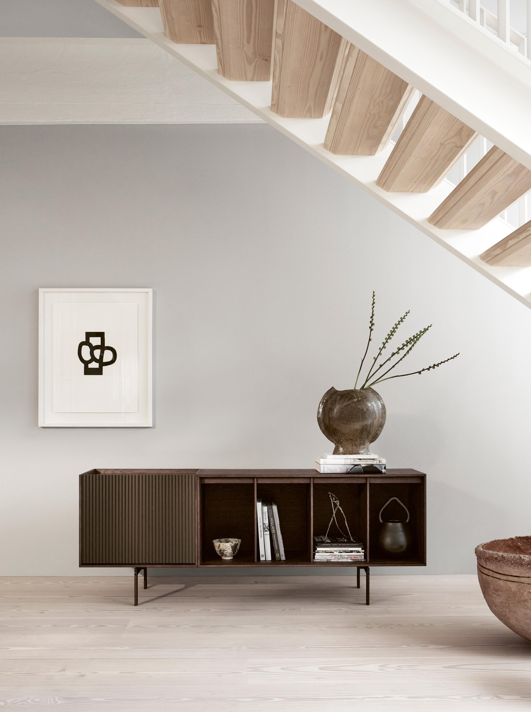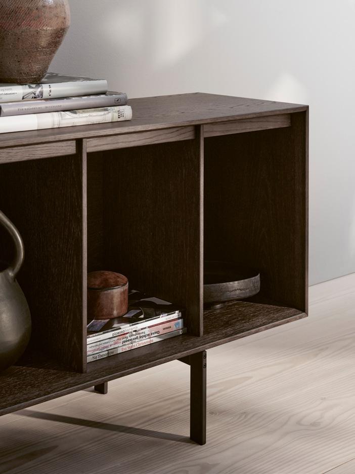 The Vipp Cabinet system is available in two colour combinations: dark oak, Pietra Grey marble, and dark anodized aluminium, or light oak, Sky grey marble, and light anodized aluminium. Keep objects visible with open cases and for the rest add a reeded aluminum door for cover.