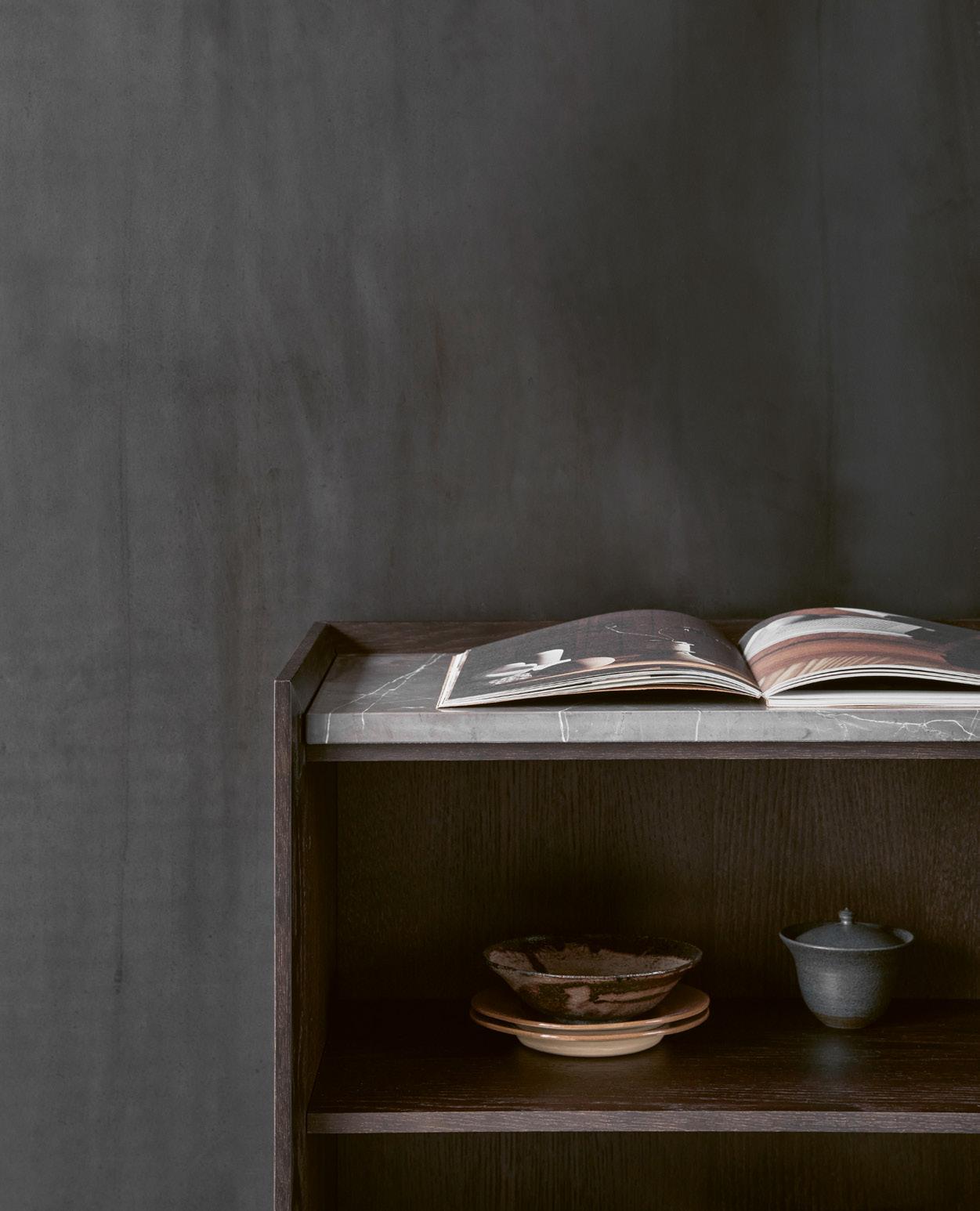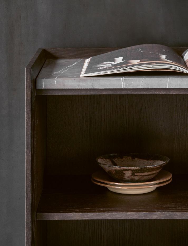 Or opt for a dark version with a material composition of dark oak veneer, Pietra Grey marble, and dark anodized aluminium.
