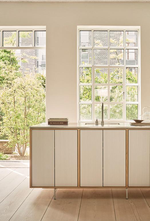 The cabinets are placed on top of the frame, followed by the installation of the side panels. Finally, the worktop is mounted. Pipes and cables are concealed by a steel collar on the floor.