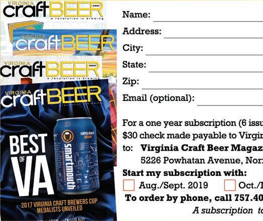 Also in this issue, Annie Tobey shares Vasen Brewing Company’s Nordic roots and connection to the great outdoors; Michael Jarvis shines a light on Old Ox Brewery’s satellite touch-down in downtown Middleburg; Jefferson Evans and Chuck Triplett turn us on to Front Royal Brewing Company; Diane Catanzaro and husband Chris Jones report on the Precarious Beer Hall in Colonial Williamsburg and interview three “local” Virginia bands tapped to perform at Lockn’.
