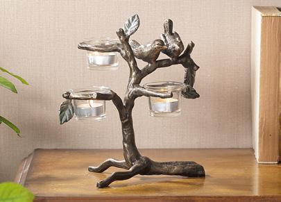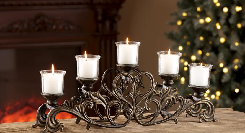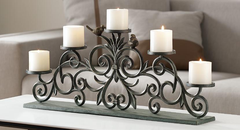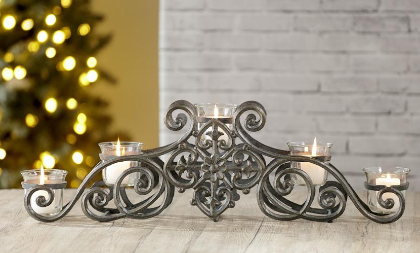D. Fleur Solitaire Candelabra in Zinc VB35222 $120 Cast Aluminum & Glass 9"H 29.5"W 5"D, Votive candles not included.