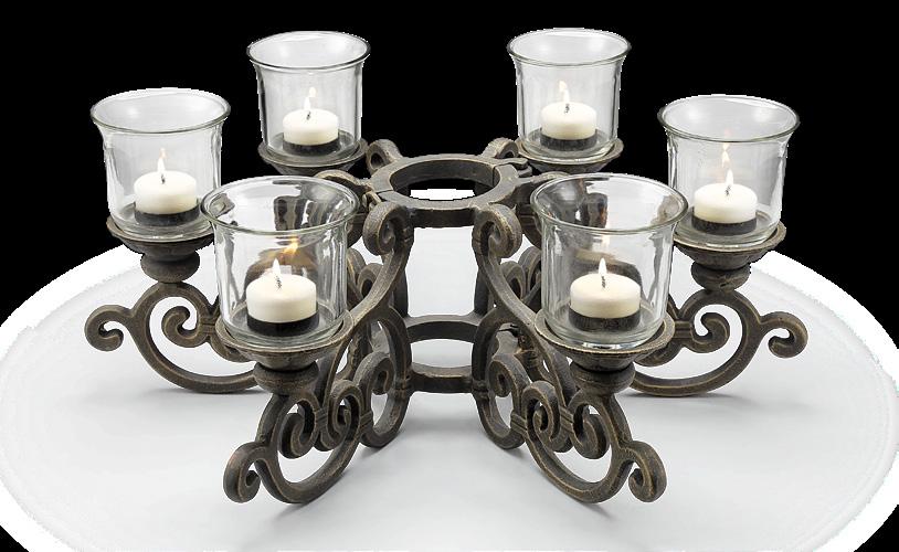 Cast Aluminum & Glass, 8"H 18.5"W 16.5"D Candles not included.