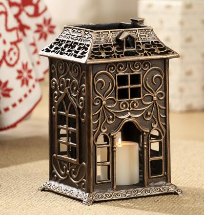 Cast Aluminum, 12"H 29"W 4.5"D Houses can be rearranged. Holds tealights, not included.