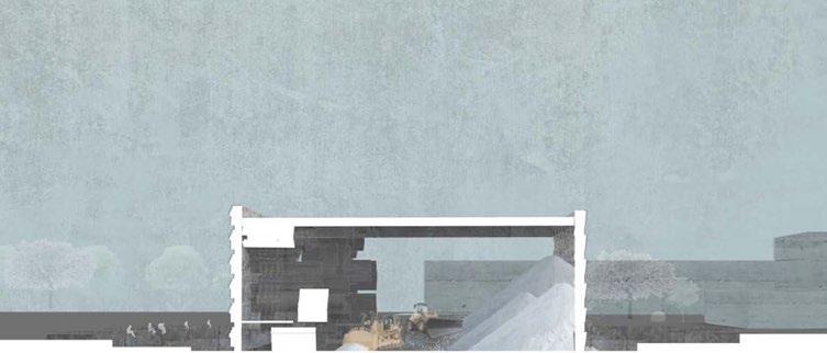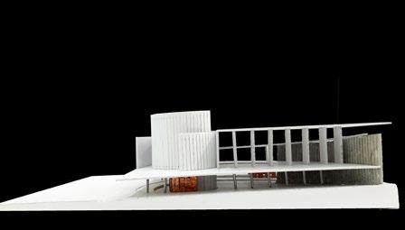 This cultural center aims to reconnect the site in Fulton, NY to the local river and become a catalyst for educational, research, and job opportunities. Alongside this, it aims to facilitate spaces that allow the local community to advance their soft professional skills through new access to technology. The design of the building is disrupted by an escalator that cuts through the building and extends out into the city. This serves as a literal representation of the divide between the site, environment and natural surroundings. The escalator also serves as a programmatic element that leads you to a cafe on the rooftop. This cafe is framed and identifiable through the differentiation of materiality, specifically due to its relationship to the river and the views it begins to create. With this, we see the escalator no longer as a divisive element but one that unifies with the surrounding context.