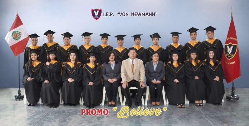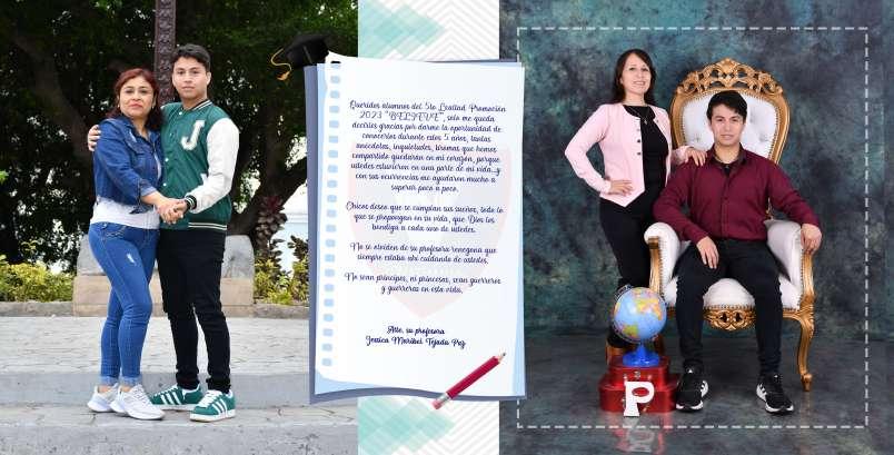 Fotografía con uniforme escolar o toga acompañado de su profesor(a).