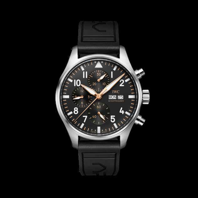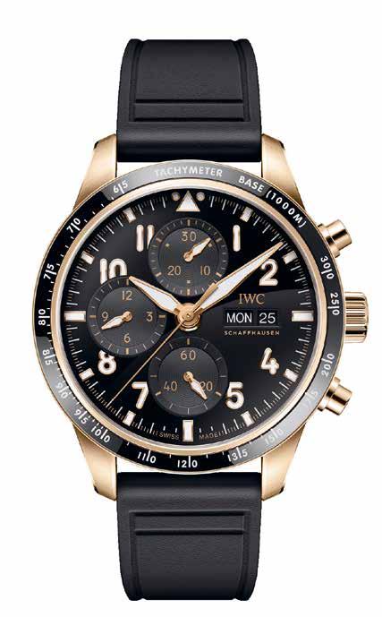 Dass Leistung und Eleganz kein Widerspruch sind, beweist die neue Pilot’s Watch Performance Chronograph 41. Der Chronograph mit dem IWC-Manufakturkaliber 69385 und der Keramiklünette mit Tachymeterskala ist jetzt zum ersten Mal mit einem Gehäuse aus 18-Karat Rotgold erhältlich. Das schwarze Lack-Zifferblatt wird in einem aufwendigen Prozess gefertigt, die Appliken von Hand gesetzt und mit Super-LumiNova® befüllt. Für Vielseitigkeit sorgen 10 bar Wasserdichtigkeit sowie das schwarze Kautschukarmband mit dem EasX-CHANGE® Schnellwechselsystem.