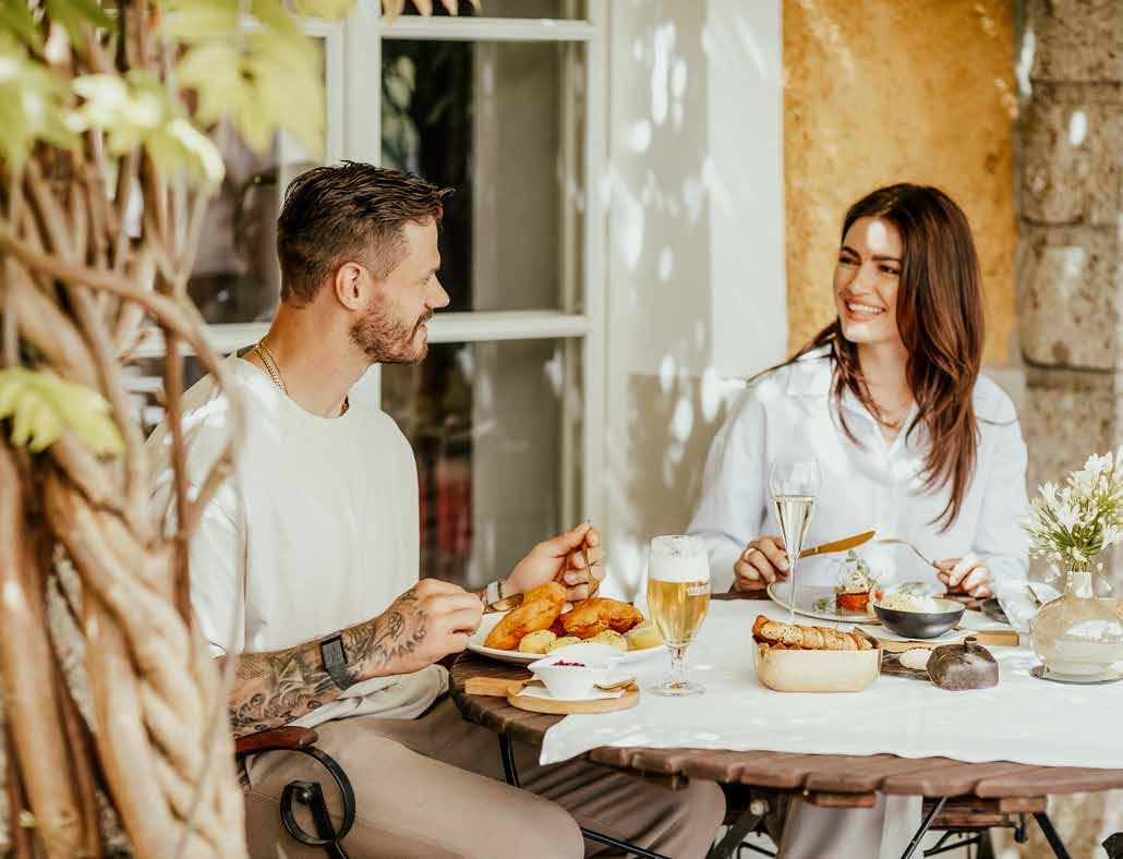 Wenn das Wiener Schnitzel so luftig wie ein Polster sein soll, dann ist das Restaurant Merkel und Merkel im Gwandhaus neuerdings eine Anlaufstation bei Verena und Thomas Raffl. Denn: »Wenn sich in Salzburg kulinarisch was tut, sind wir neugierig aufs Ausprobieren«, sagt Verena und genießt auf der Terrasse bei Sonnenschein ein Gläschen Crémant sowie das Beef Tatar. »Das lacht uns immer an«, bestätigt Thomas. Das anerkennende Kopfnicken der beiden beim Kosten freut Ramona Merkel, die mit ihrem Mann Alexander für die erfrischende Küche sorgt. Auf der Karte stehen österreichische Klassiker; die Tellersprache ist alles andere als traditionell. Die Merkels richten ihre Speisen wunderbar modern an. Zum Wiener gibt’s eine Zitronenmarmelade. Der Tafelspitz ist so zart, dass man kein Messer zum Schneiden bräuchte. Zum rosa Rehrücken gesellen sich Sellerie und Heidelbeeren. Und das bei schönster Sicht aufs Tennengebirge.