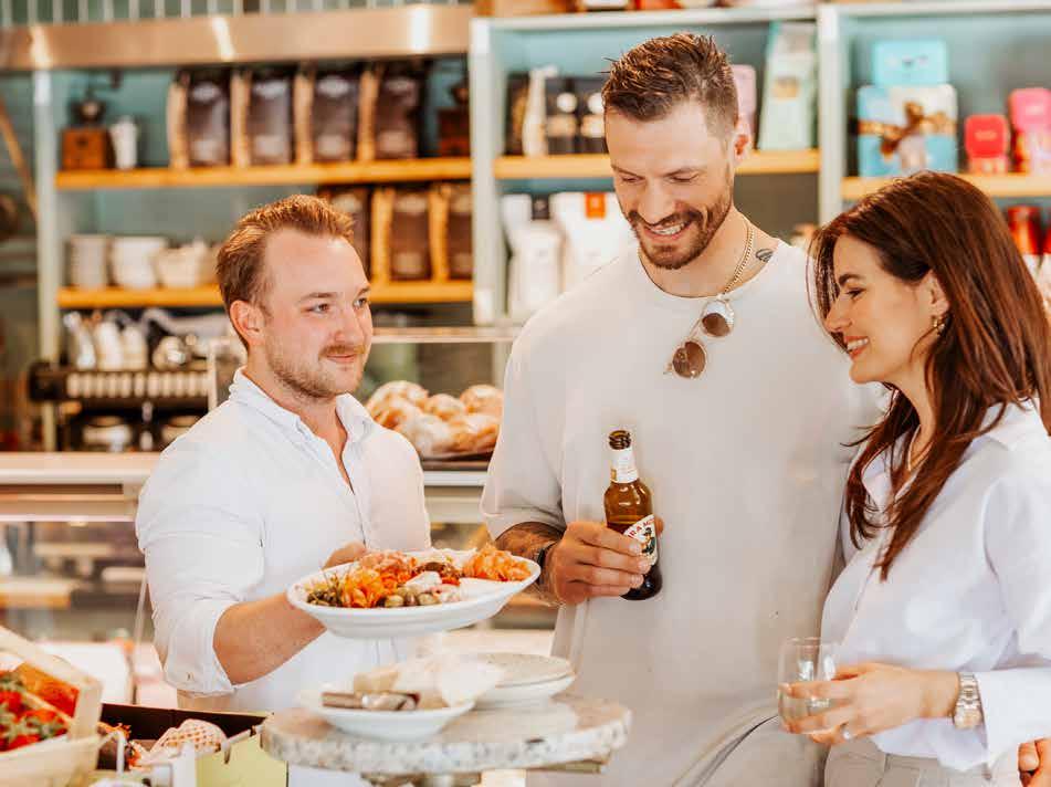 »Geh’ma zur Mama«, lautet der Geheimcode, wenn die Spieler des EC Red Bull Salzburg in ihrer Mittagspause Hunger haben. Dann wissen alle: Es geht in die Imbergstraße. Dort wartet allerdings weniger eine Mama als Moritz Stoll. Oder Schwester Maria oder sein Papa Manfred. Die »Feinkost Stoll« ist ein Familienbetrieb, 2026 feiert der Laden 40. Geburtstag. Wer sich mit aromatischem Parmesan, feinem Prosciutto, Antipasti oder dem passenden Getränk zum Schmaus versorgen will, ist hier richtig. Oder wer eben zu Mittag hungrig ist, wie Thomas Raffl betont. »Die Portionen sind so gut, dass alle satt werden«. Mit wem er am häufigsten zum Lunch ins »Stoll« aufbricht? »Mit dem Florian Baltram, wir verstehen uns super!« Serviert wird »Pasta ohne Schnickschnack«, erklärt Moritz. Seine Arrabbiata ist so simpel wie köstlich, dasselbe gilt fürs Chili con carne. Kohlehydrate und Eiweiß für Spitzensportler? Kein Problem für die Stolls.