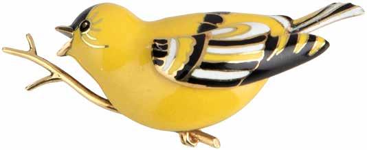 In den höchsten Tönen zwitschert die naturgetreu gearbeitete Vogelbrosche aus Gold und Email von der Kunstfertigkeit aus der Schmuckwerkstatt Varga.