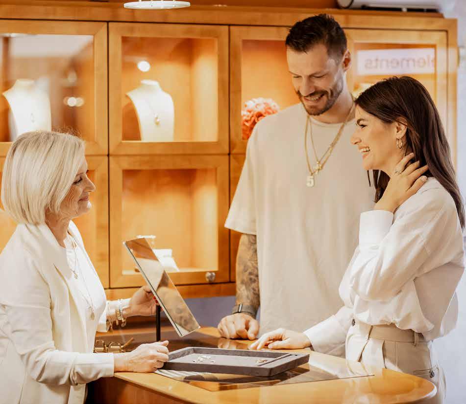 Hier liegt Liebe in der Luft: Das erste Schmuckstück, das Verena Raffl von ihrem Thomas bekommen hat, ist eine Kette, die er bei Juwelier Schneider in der Schmuckpassage anfertigen lies. Auf dem Anhänger ist der Kennenlerntag vor rund 13 Jahren eingraviert. Ein paar Jahre später bekam Thomas von Verena auch eine Kette geschenkt – ein Goldkreuz mit Diamanten und eingraviertem Hochzeitsdatum. »Vor dem Sport muss jeder Schmuck vom Hals und den Fingern runter, Ketten oder Ringe zu tragen wäre am Eis gefährlich«, erklärt Thomas, »doch ansonsten ist Verenas Kette immer bei mir. Übrigens trage ich auch eine für mich angefertigte Fünf, meine Spielernummer, als Kettenanhänger. Bezüglich der Stärke und Größe meiner Fünf wurde ich super gut beraten, damit diese auch zu mir passt.« Angefertigt werden die selbstdesignten Stücke übrigens in der eigenen Werkstätte im ersten Stock.