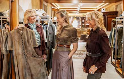 »Ja, mit dem Herbst stehen der Rupertikirtag, das Oktoberfest und viele andere Anlässe bevor, bei denen man mit Tracht genau richtig gestylt ist«, empfängt Geschäftsinhaberin Daniela Meindl Mutter und Tochter Degn. »Aber eigentlich«, meint Mucky, »liebe ich bei Meindl die Leder-Pieces. Das sind nicht nur tolle Kleidungsstücke in hervorragenden Qualität – das sind Investments fürs Leben! Ich habe Mäntel, Hosen usw. in Leder.« Sagt’s – und schlüpft in eine grüne Lederhose und ein wunderbar weiches schokobraunes Lederhemd und die dazu passenden Boots. Susanne hat sich ebenfalls für ein Oberteil aus Leder, dafür aber für einen weich fallenden, wadenlangen Rock aus italienischem Pepitaloden mit Kaschmiranteil und dazu feste braune Schnür-Stiefel entschieden. »Am Rupertikirtag braucht man gute Schuhe«, lacht sie und meint weiter: »Den Rock würde ich – kombiniert mit einem Pullover oder einem schönen Shirt – jederzeit ins Büro anziehen –superbequem!«