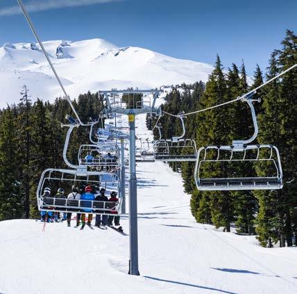 MT. BACHELOR, the largest ski resort in the Pacific Northwest, offers access to 4,300 acres of terrain on an inactive volcano that last erupted more than 8,000 years ago. The Summit Express chairlift reaches an elevation of 9,065 feet.