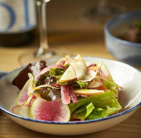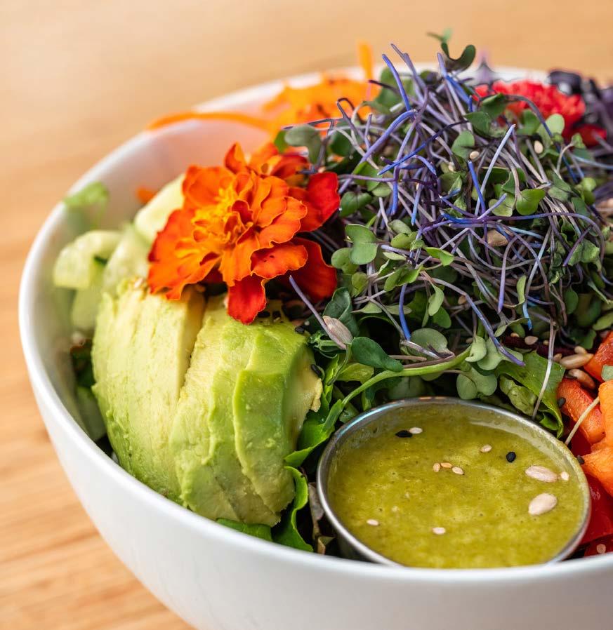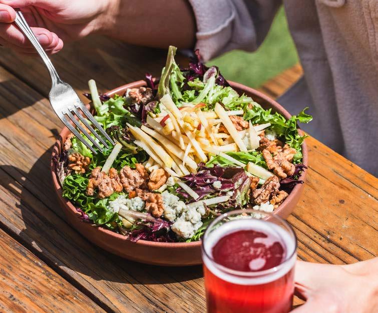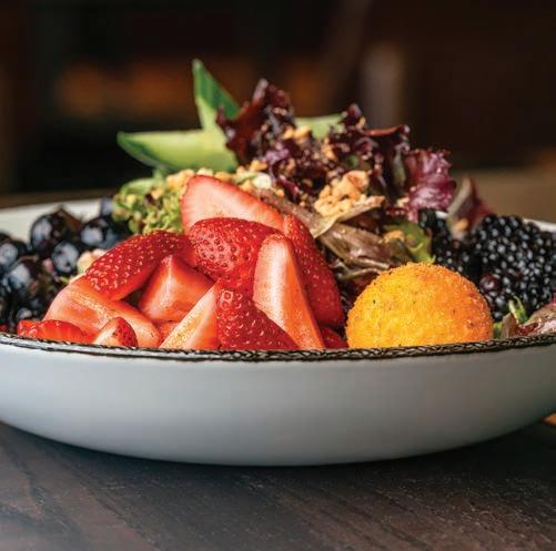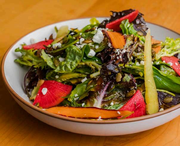 Tender greens with locally sourced apples, strawberries and blackberries, heaped with candied walnuts, red onion, goat cheese crumbles and our house raspberry vinaigrette