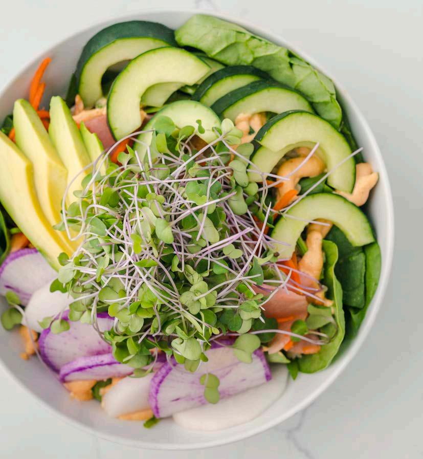 Wild harvested top quality tuna tossed in a sriracha soy sauce and served with quinoa, tender greens, fresh mango salsa, avocado, carrots, scallions, cucumber, sesame seeds and a drizzle of Sriracha aoli and unagi sauce