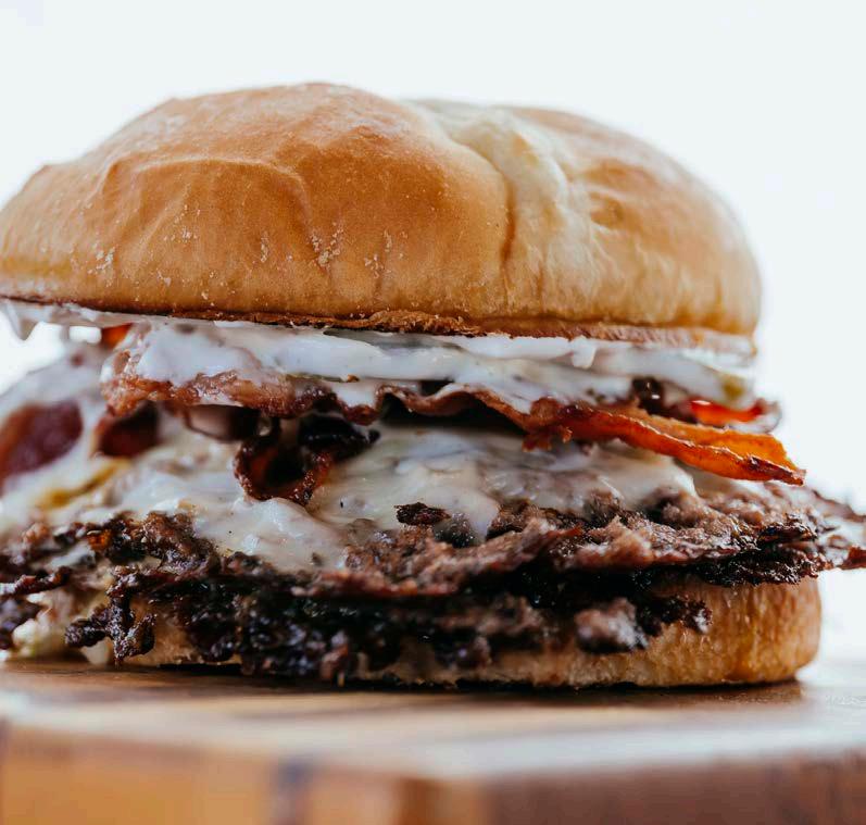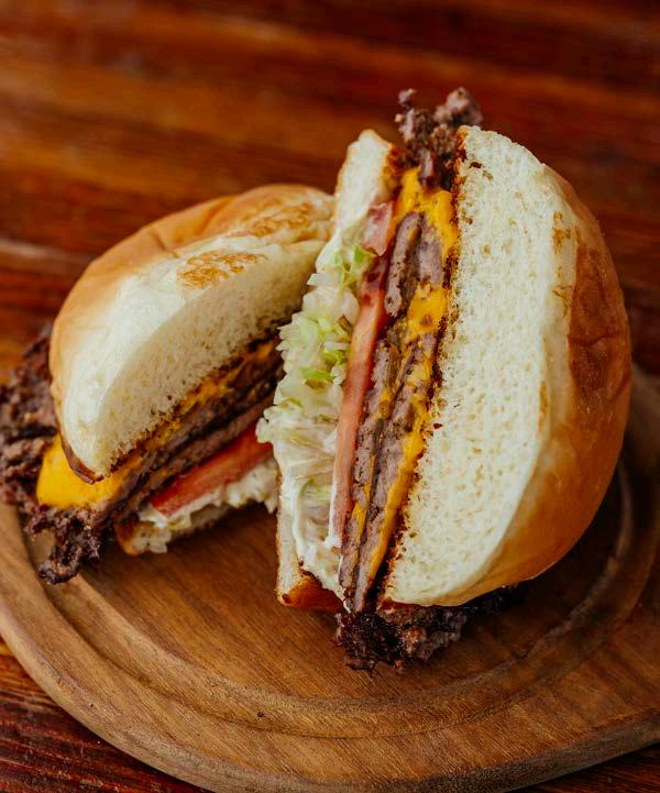 Garlic butter reversed bun, melty sharp cheddar cheese, 1/2 lb. double smash patties, Brand sauce and bacon onion jam