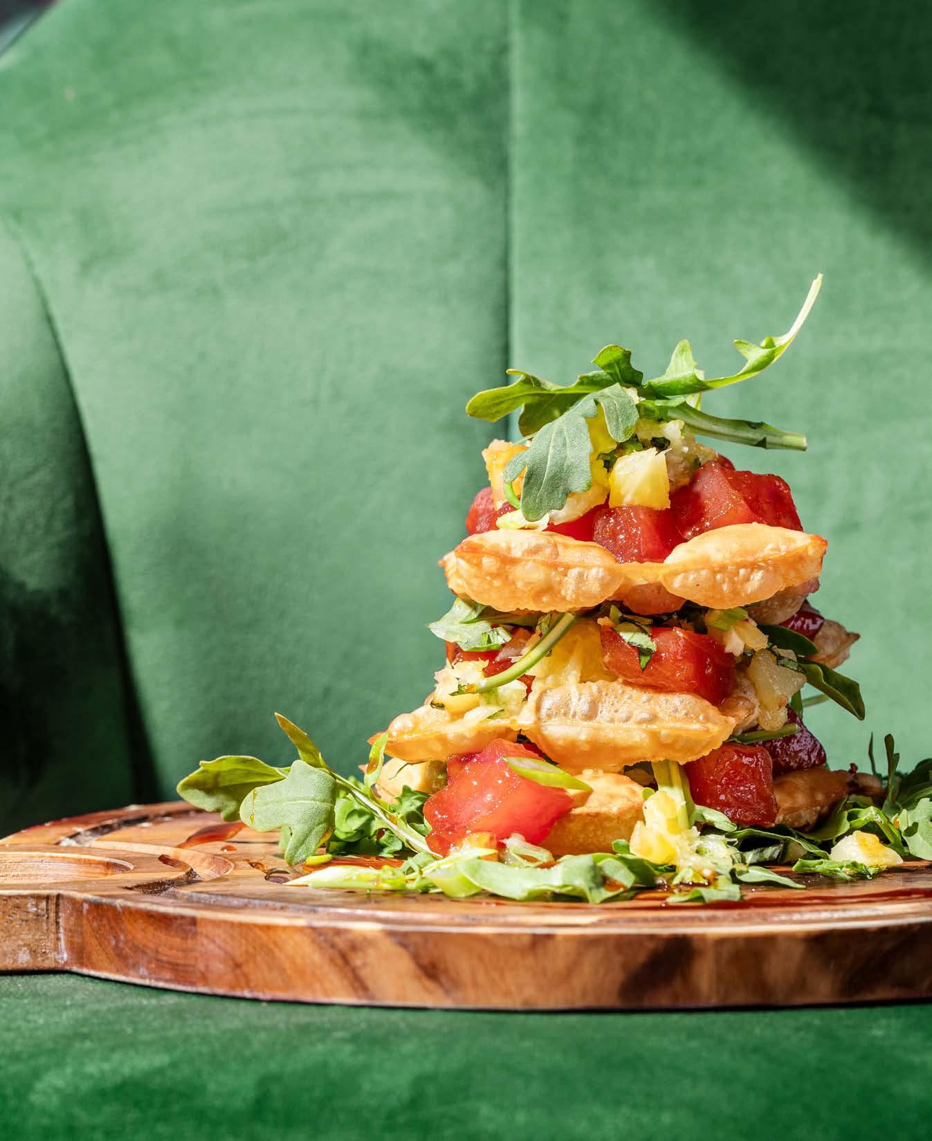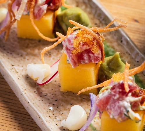 Wild harvested top-quality yellowfin tuna tossed in a Sriracha soy sauce with avocado, fresh mango salsa, sliced jalapeño, scallions, sesame seeds and a drizzle of Sriracha aoli and unagi sauce. Served on a bed of fried wontons