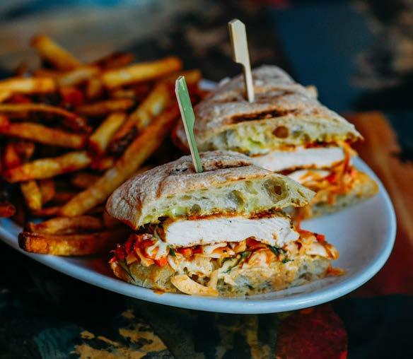 Juicy and perfectly grilled chicken breast, fresh mozzarella, roasted tomatoes, pesto aioli and a drizzle of balsamic reduction, served on a toasted ciabatta roll