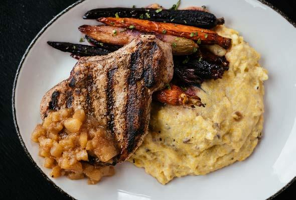 Charred onion polenta, cider roasted rainbow carrots, spiced apple chutney