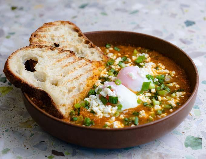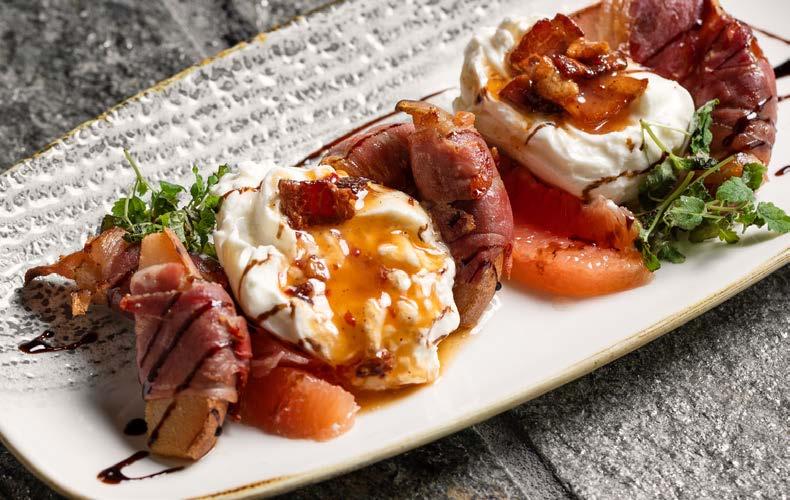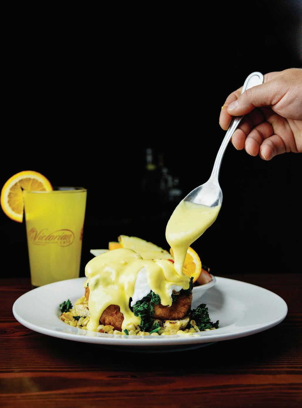 Two ground beef patties, bacon, melty cheddar cheese, two poached eggs and house made tomato Hollandaise sauce atop toasted sourdough bread, topped with chives.