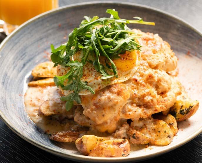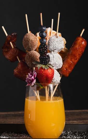 Petite sugar pearled waffles, topped with honey butter glazed fried chicken and fresh fruit. Make it spicy Nashville chicken if you like the heat!