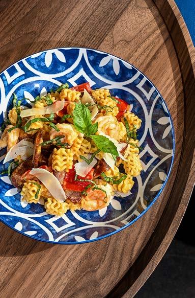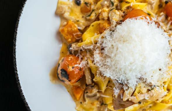 Comfort in a bowl — linguini bathed in a creamy tomato vodka sauce with savory Italian sausage, smoky pancetta, caramelized onions and garlic. Simmered slow and finished with a touch of spice and Parmesan. Served with toasted garlic ciabatta bread