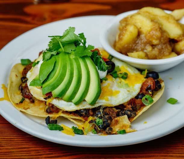 Two corn tortillas topped with refried beans, grilled onions, homemade ranchero salsa served warm, chorizo, two fried eggs, cotija cheese, cilantro, avocado.