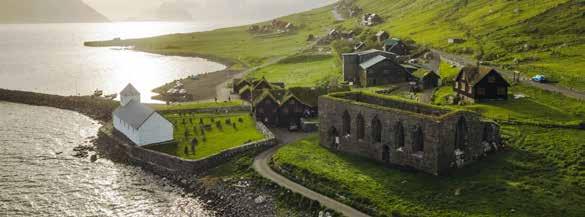 Kirkjubøur er Færøernes vigtigste historiske sted. De imponerende ruiner af Sankt Magnus domkirken stammer fra det 13. århundrede, mens kirken og familiehuset på stedet, Roykstovan, begge stammer fra middelalderen. Roykstovan er et af verdens ældste beboede bjælkehuse. Se mere om Kirkjubøur på side 58.
