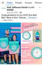 The inaugural Jefferson Parish Sno-Ball Blitz was met with great enthusiasm and success during the summer. The program featured sno-ball stands throughout Jefferson Parish offering a specialty sno-ball with a twist...a competition for the Best in Sno! Locals were able to boast about (and vote for) their hometown favorite, while visitors were introduced to a local tradition that just happens to taste great too! The 2022 Best in Sno was awarded to Droopy's Snowballs of Harahan.