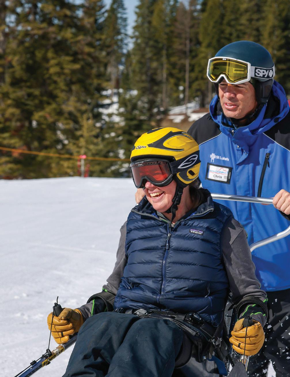 Once layered for the weather, Messenger said she spent the first hour or so getting adjusted to the sit ski and working with her instructors on the plan for the tether support and practicing with the outriggers as she got acquainted with the equipment. Then she hit the bunny hill. “It is such a crazy feeling,” she says, “In my brain, I keep wanting to control the ski with my legs, which, of course, I can’t do anything with.” Messenger said that was one of the Continued page 14