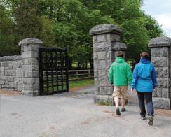 Turn left at a T junction, then right down Limekiln Road. This brings you to the A25 road on the outskirts of Newry Turn left , then quickly right to enter the grounds of Derrymore House, an eighteenth century, cottage style house and demesne now owned by the National Trust . Head along the driveway towards the yellow, thatched cottage. Where the road turns left , continue ahead along a track . Pass between grassy pastures, then through the beautiful planted woodland of the estate grounds.