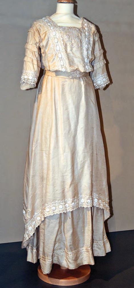 Purchased in 1914 in Fosters drapery store, Newry, the silk and lace wedding dress has a matching pair of silk shoes. It belonged to Ella McGaffin who became Mrs Poland.