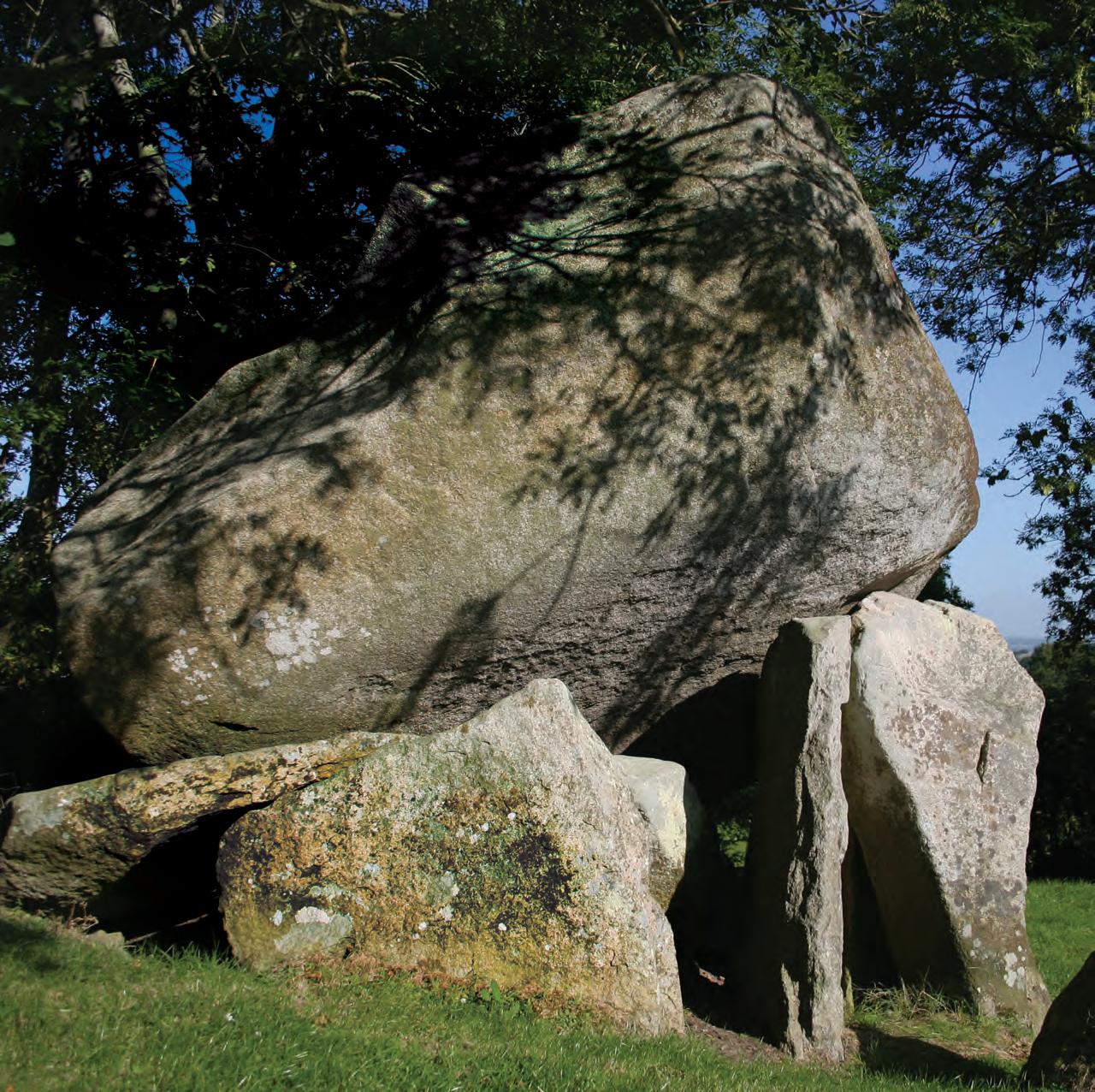 Near Hilltown, in the foothills of the Mourne Mountains. The enormous capstone of the tomb has slipped from its original position and would have roofed the rectangular chamber. Investigations in the first half of the 19th century uncovered a cremation pottery vessel and a flint arrowhead. Known as Finn McCool’s Fingerstone, local tradition recorded by E. Estyn Evans relates that Finn threw the capstone from Spelga and that he sleeps underneath.