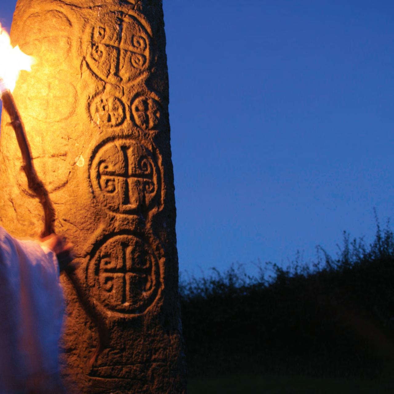 Kilbroney small cross has endured centuries of weather. Lamplight reveals its endearing face, demonstrating the sculptor’s playful artistry. At dawn, at dusk or by moonlight many sites have an ethereal presence. Viewing