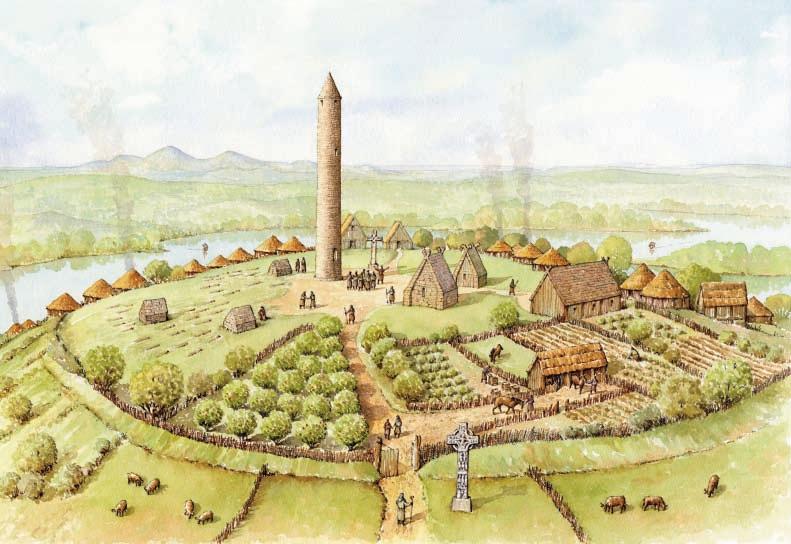 It was claimed that St Columba opened Patrick’s grave here in 553 and found his gospel book, bell and chalice. Columba gave Patrick’s chalice to the church of Down. At about this time a timber church was built over Patrick’s grave. In 584 the Annals of Ulster record the death of Fergus, bishop of Down, and a monastery is first mentioned here in 753 AD. It was attacked by the Vikings in 825, 940 and 989 AD.