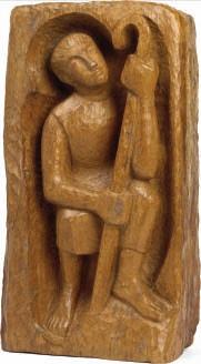 St Patrick as a boy on Slemish Mountain, wood carving by Imogen Stuart.
